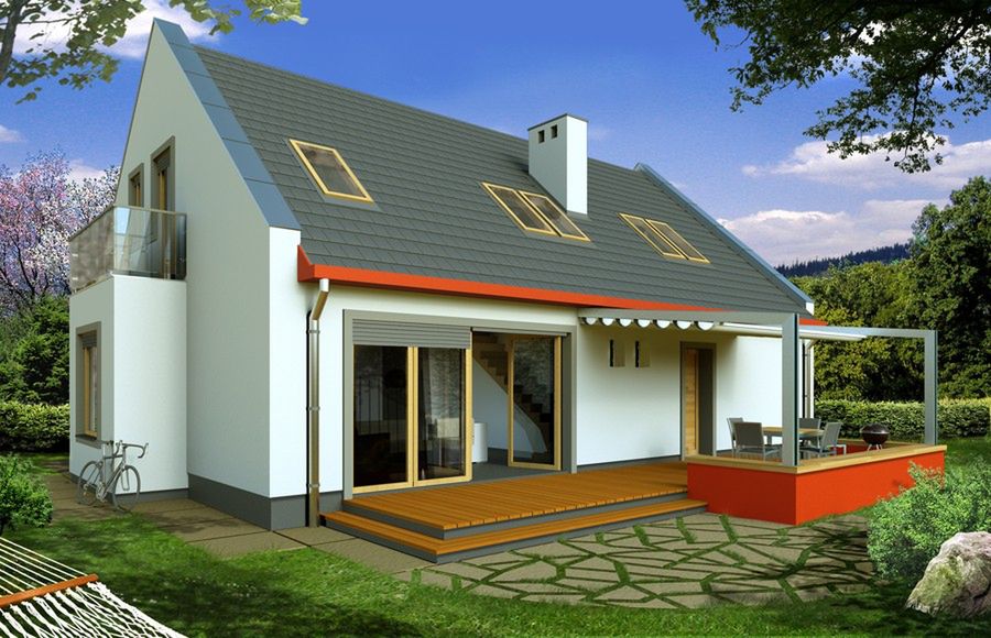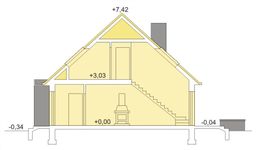 Graficzne opracowanie rzutów poglądowych widocznych na karcie projektu zostało wykonane przez Extradom.pl. Prezentowane przez Extradom.pl wizualizacje wykonane zostały przez autora projektu i należy poczytywać je jedynie za przykład i propozycję wykończenia, wizję architektoniczną autora projektu. Ostateczne wykończenie budynku może nastąpić na wiele sposobów. Szczegółowe rozwiązania zastosowane w oferowanej dokumentacji - w tym również ilość, lokalizacje i wygląd okien, drzwi, kominów - mogą w niewielkim stopniu różnić się od prezentowanej wizualizacji budynku.