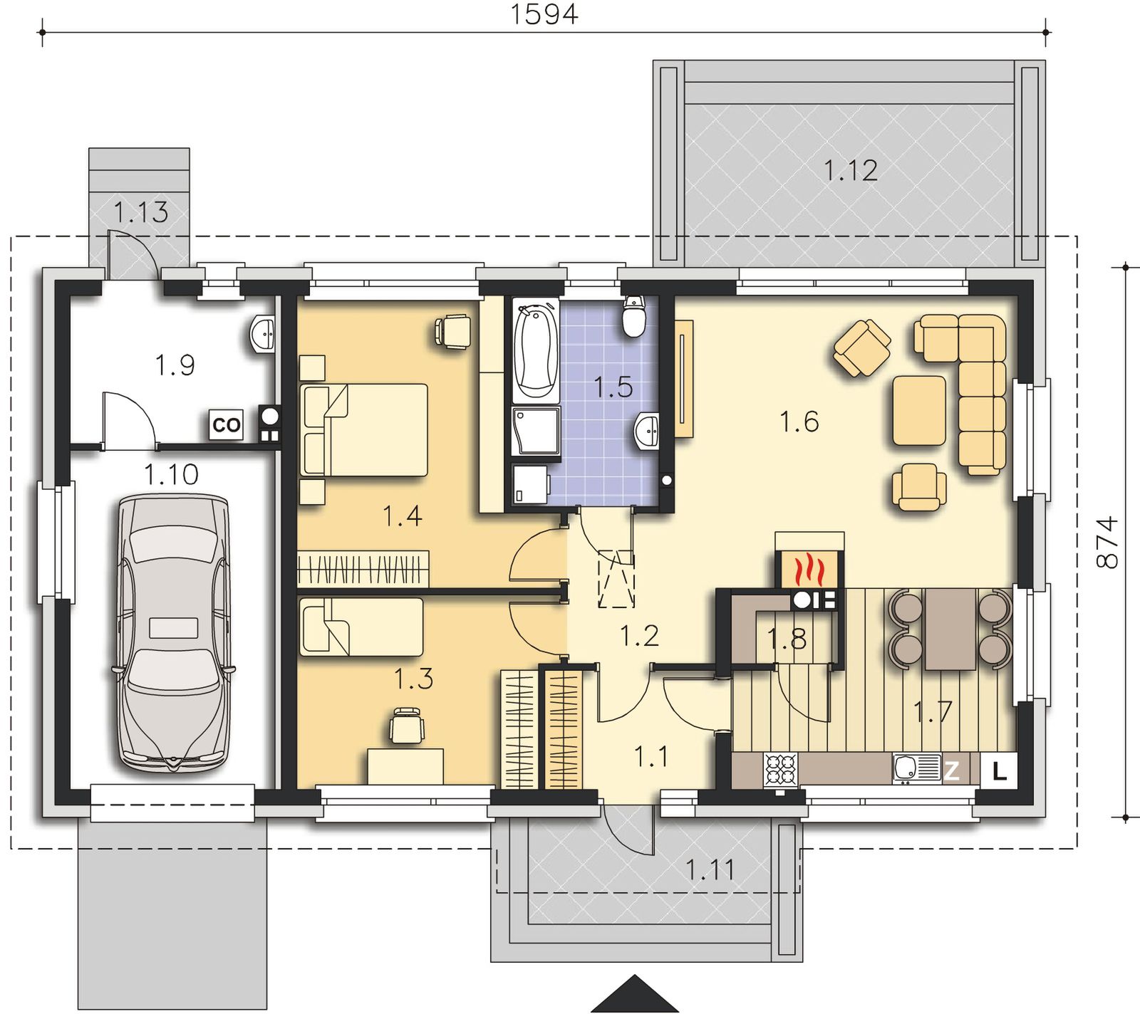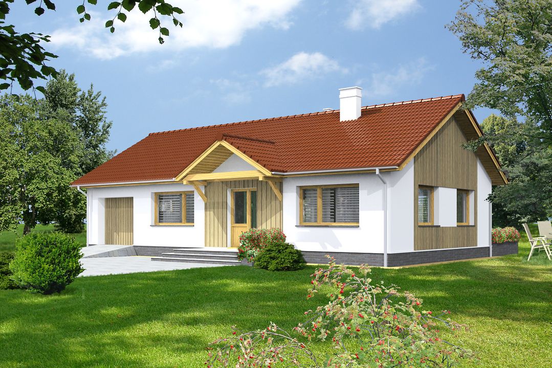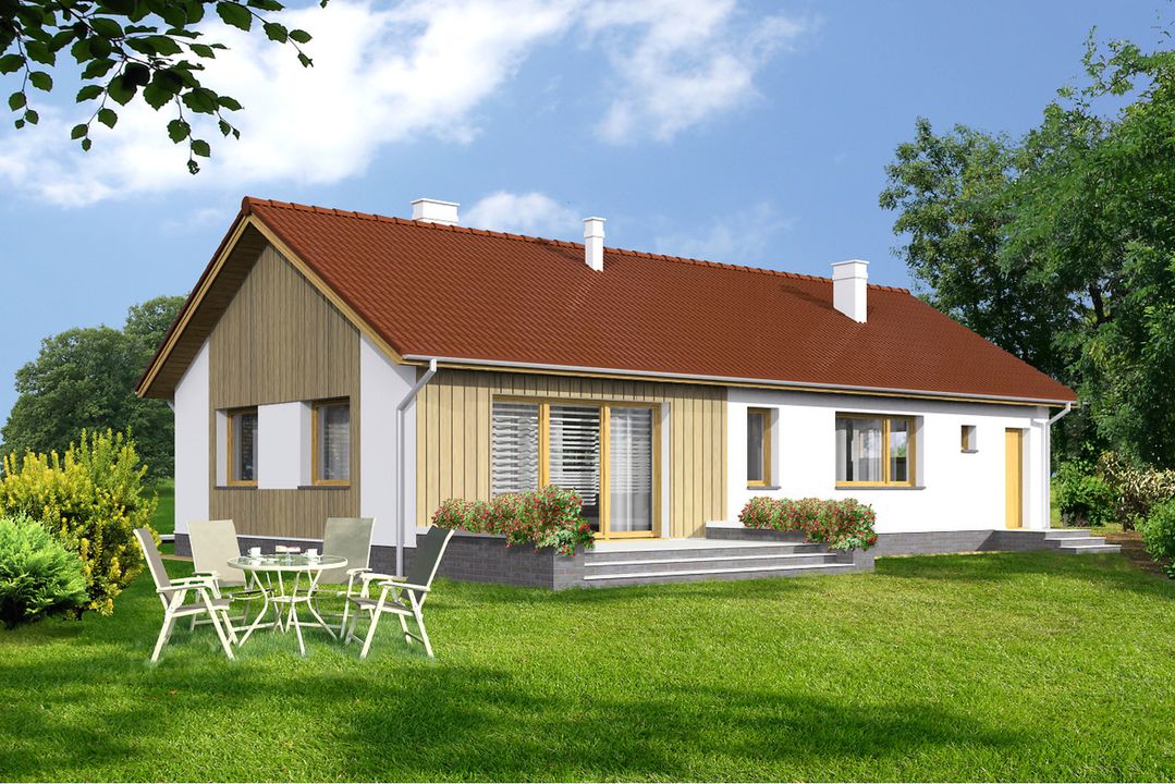 Graficzne opracowanie rzutów poglądowych widocznych na karcie projektu zostało wykonane przez Extradom.pl. Prezentowane przez Extradom.pl wizualizacje wykonane zostały przez autora projektu i należy poczytywać je jedynie za przykład i propozycję wykończenia, wizję architektoniczną autora projektu. Ostateczne wykończenie budynku może nastąpić na wiele sposobów. Szczegółowe rozwiązania zastosowane w oferowanej dokumentacji - w tym również ilość, lokalizacje i wygląd okien, drzwi, kominów - mogą w niewielkim stopniu różnić się od prezentowanej wizualizacji budynku.