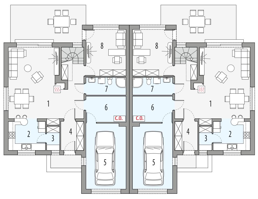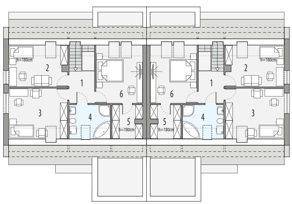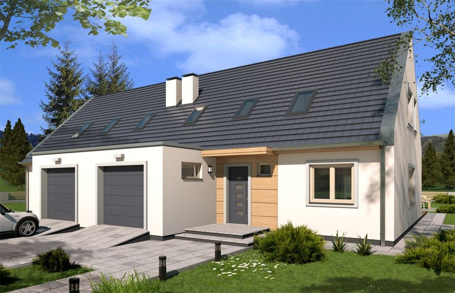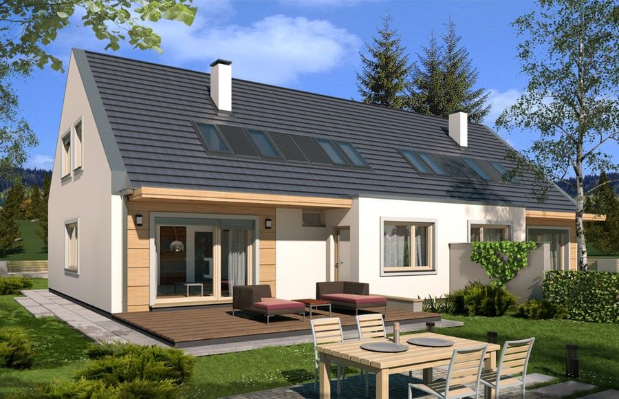 Graficzne opracowanie rzutów poglądowych widocznych na karcie projektu zostało wykonane przez Extradom.pl. Prezentowane przez Extradom.pl wizualizacje wykonane zostały przez autora projektu i należy poczytywać je jedynie za przykład i propozycję wykończenia, wizję architektoniczną autora projektu. Ostateczne wykończenie budynku może nastąpić na wiele sposobów. Szczegółowe rozwiązania zastosowane w oferowanej dokumentacji - w tym również ilość, lokalizacje i wygląd okien, drzwi, kominów - mogą w niewielkim stopniu różnić się od prezentowanej wizualizacji budynku.