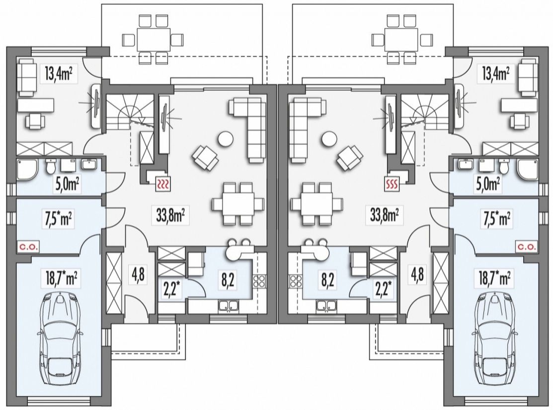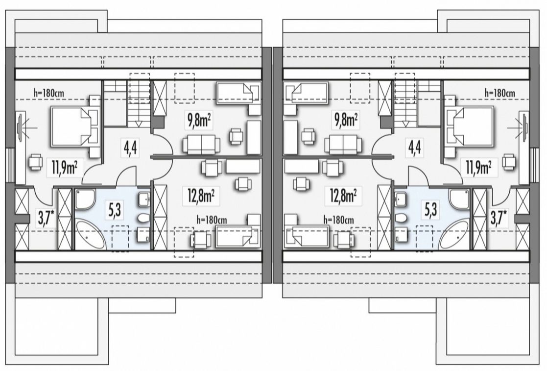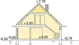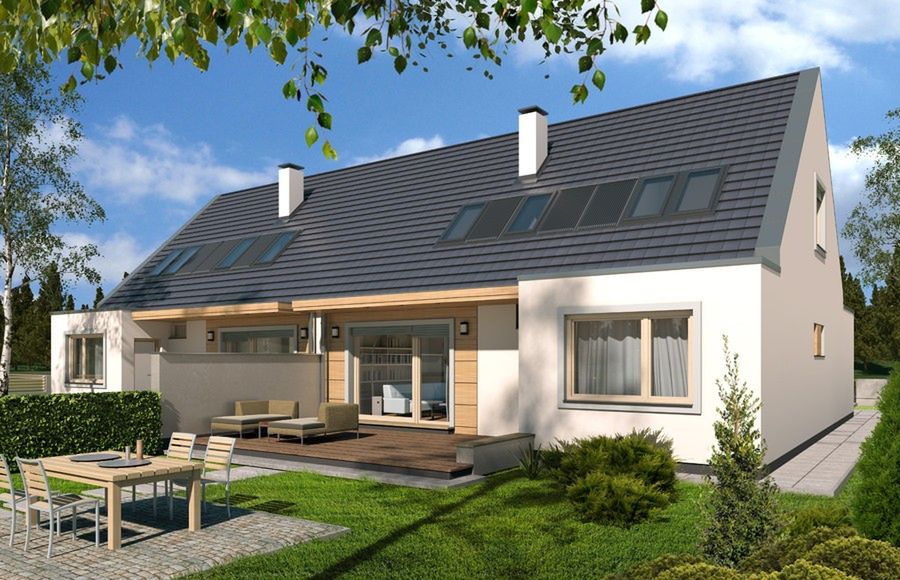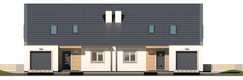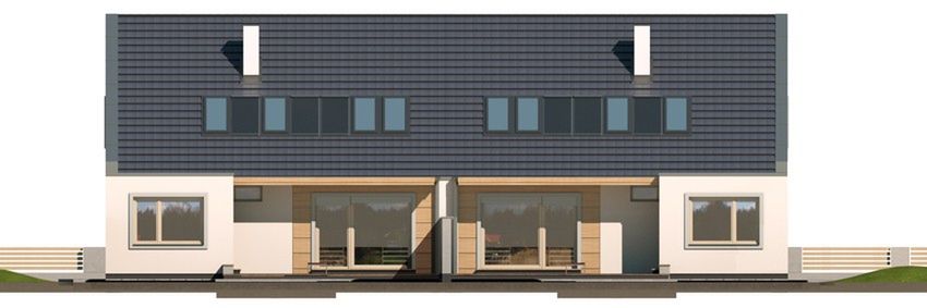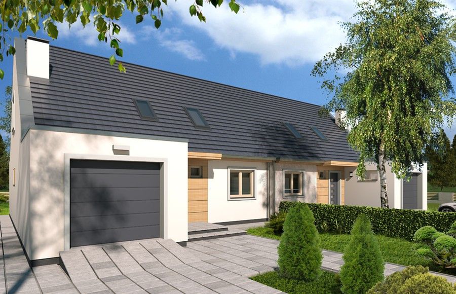 Graficzne opracowanie rzutów poglądowych widocznych na karcie projektu zostało wykonane przez Extradom.pl. Prezentowane przez Extradom.pl wizualizacje wykonane zostały przez autora projektu i należy poczytywać je jedynie za przykład i propozycję wykończenia, wizję architektoniczną autora projektu. Ostateczne wykończenie budynku może nastąpić na wiele sposobów. Szczegółowe rozwiązania zastosowane w oferowanej dokumentacji - w tym również ilość, lokalizacje i wygląd okien, drzwi, kominów - mogą w niewielkim stopniu różnić się od prezentowanej wizualizacji budynku.