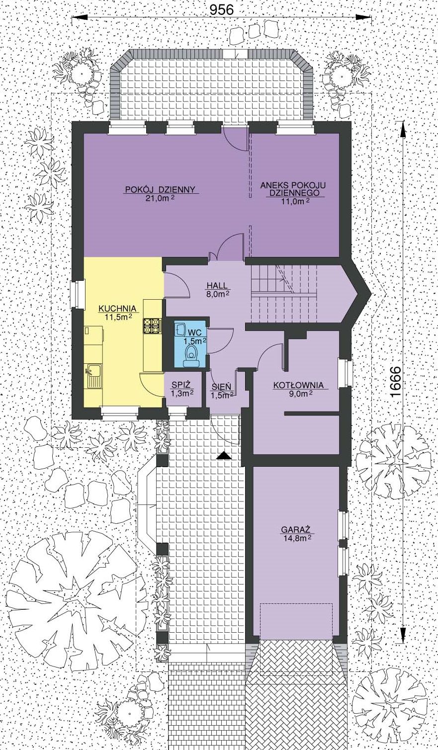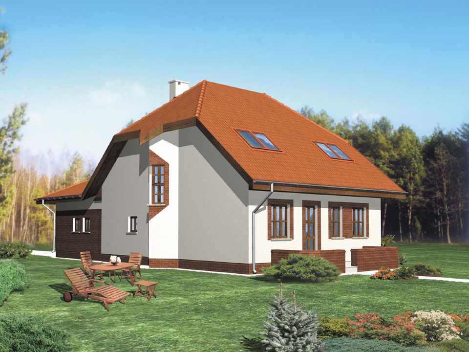 Graficzne opracowanie rzutów poglądowych widocznych na karcie projektu zostało wykonane przez Extradom.pl. Prezentowane przez Extradom.pl wizualizacje wykonane zostały przez autora projektu i należy poczytywać je jedynie za przykład i propozycję wykończenia, wizję architektoniczną autora projektu. Ostateczne wykończenie budynku może nastąpić na wiele sposobów. Szczegółowe rozwiązania zastosowane w oferowanej dokumentacji - w tym również ilość, lokalizacje i wygląd okien, drzwi, kominów - mogą w niewielkim stopniu różnić się od prezentowanej wizualizacji budynku.