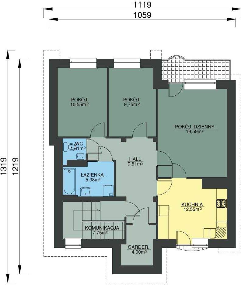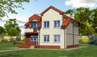 Graficzne opracowanie rzutów poglądowych widocznych na karcie projektu zostało wykonane przez Extradom.pl. Prezentowane przez Extradom.pl wizualizacje wykonane zostały przez autora projektu i należy poczytywać je jedynie za przykład i propozycję wykończenia, wizję architektoniczną autora projektu. Ostateczne wykończenie budynku może nastąpić na wiele sposobów. Szczegółowe rozwiązania zastosowane w oferowanej dokumentacji - w tym również ilość, lokalizacje i wygląd okien, drzwi, kominów - mogą w niewielkim stopniu różnić się od prezentowanej wizualizacji budynku.