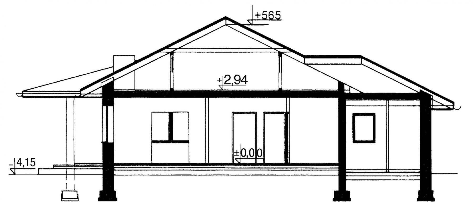 Ściany: warstwowe, ceramiczne. Stropy: gęstożebrowe. Dach: o konstrukcji drewnianej, czterospadowy o nachyleniu połaci 27°, kryty dachówką blaszaną lub bitumiczną.