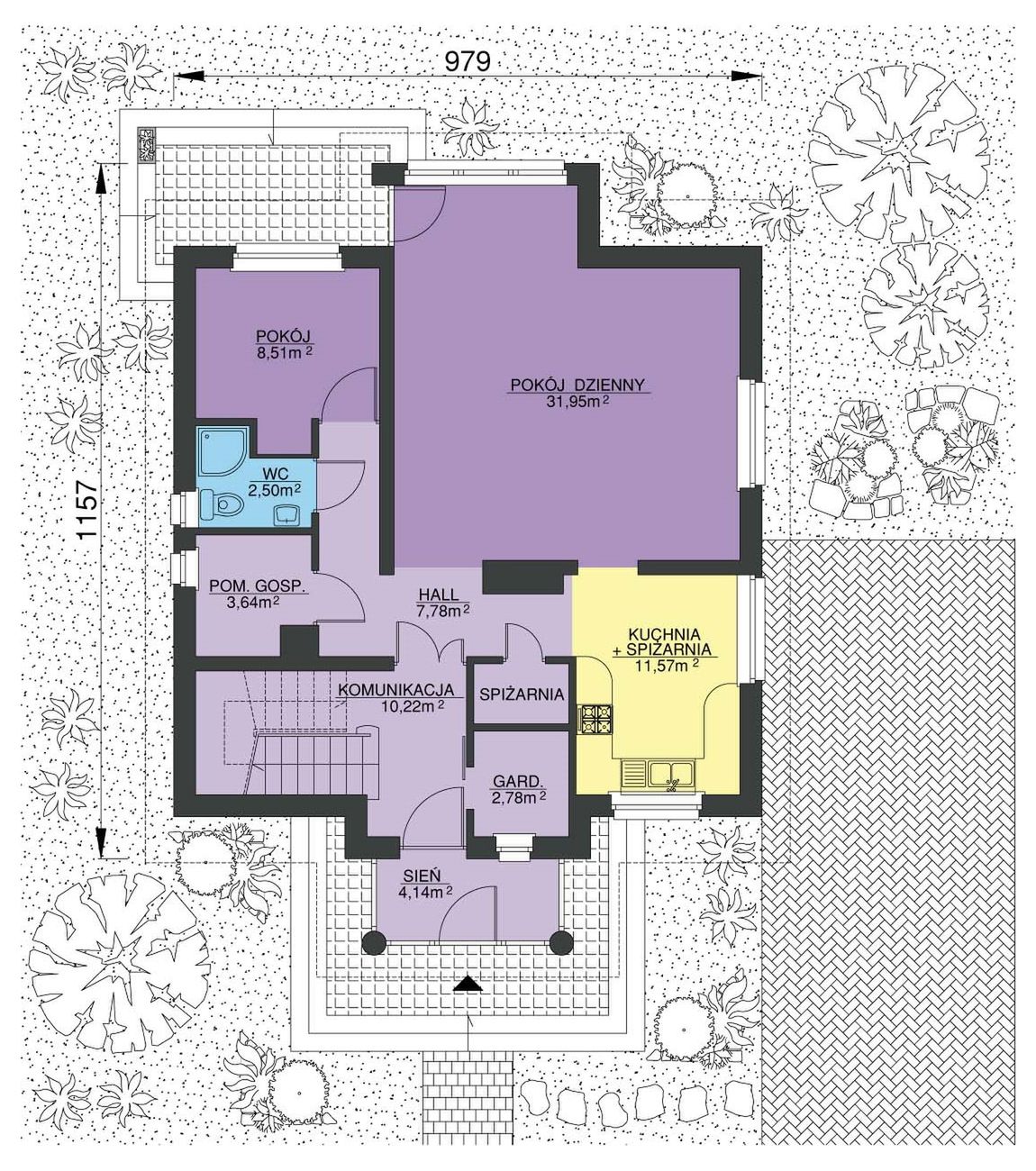 Graficzne opracowanie rzutów poglądowych widocznych na karcie projektu zostało wykonane przez Extradom.pl. Prezentowane przez Extradom.pl wizualizacje wykonane zostały przez autora projektu i należy poczytywać je jedynie za przykład i propozycję wykończenia, wizję architektoniczną autora projektu. Ostateczne wykończenie budynku może nastąpić na wiele sposobów. Szczegółowe rozwiązania zastosowane w oferowanej dokumentacji - w tym również ilość, lokalizacje i wygląd okien, drzwi, kominów - mogą w niewielkim stopniu różnić się od prezentowanej wizualizacji budynku.
