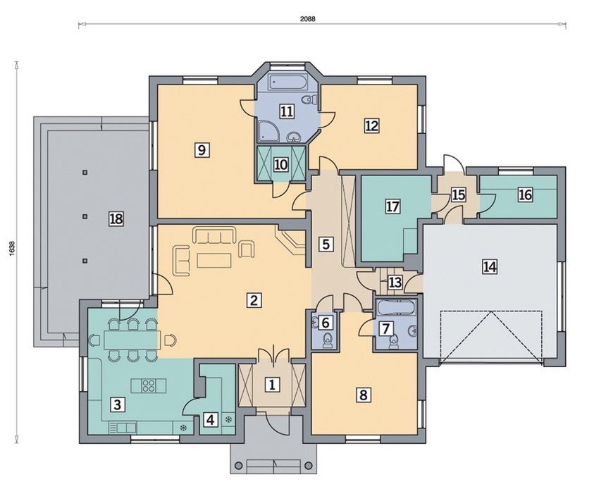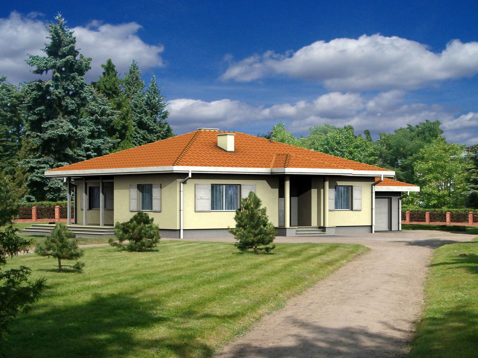 Graficzne opracowanie rzutów poglądowych widocznych na karcie projektu zostało wykonane przez Extradom.pl. Prezentowane przez Extradom.pl wizualizacje wykonane zostały przez autora projektu i należy poczytywać je jedynie za przykład i propozycję wykończenia, wizję architektoniczną autora projektu. Ostateczne wykończenie budynku może nastąpić na wiele sposobów. Szczegółowe rozwiązania zastosowane w oferowanej dokumentacji - w tym również ilość, lokalizacje i wygląd okien, drzwi, kominów - mogą w niewielkim stopniu różnić się od prezentowanej wizualizacji budynku.