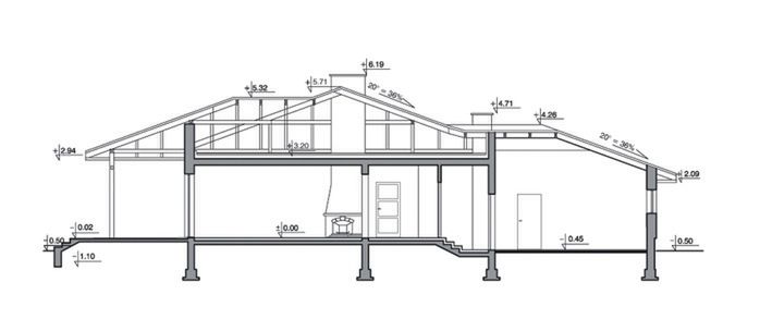 Ściany zewnętrzne nadziemia: dwuwarstwowe gr. 36 cm bloczki z gazobetonu gr. 24 cm + styropian 12 cm. Stropy: gęstożebrowe TERIVA I. Dach: wielospadowy, o konstrukcji drewnianej płatwiowo-kleszczowej. Pokrycie dachu: blacha dachówkowa, nachylenie połaci 20° (36%).