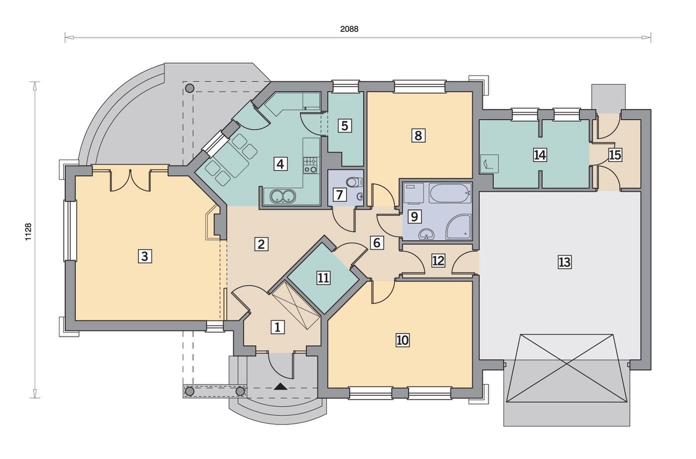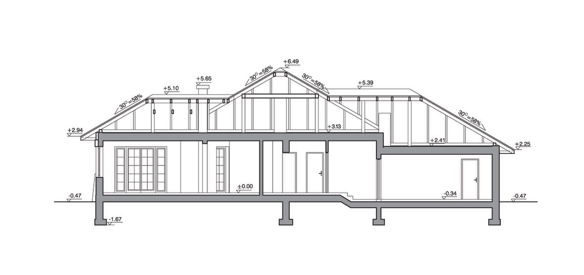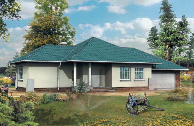 Graficzne opracowanie rzutów poglądowych widocznych na karcie projektu zostało wykonane przez Extradom.pl. Prezentowane przez Extradom.pl wizualizacje wykonane zostały przez autora projektu i należy poczytywać je jedynie za przykład i propozycję wykończenia, wizję architektoniczną autora projektu. Ostateczne wykończenie budynku może nastąpić na wiele sposobów. Szczegółowe rozwiązania zastosowane w oferowanej dokumentacji - w tym również ilość, lokalizacje i wygląd okien, drzwi, kominów - mogą w niewielkim stopniu różnić się od prezentowanej wizualizacji budynku.