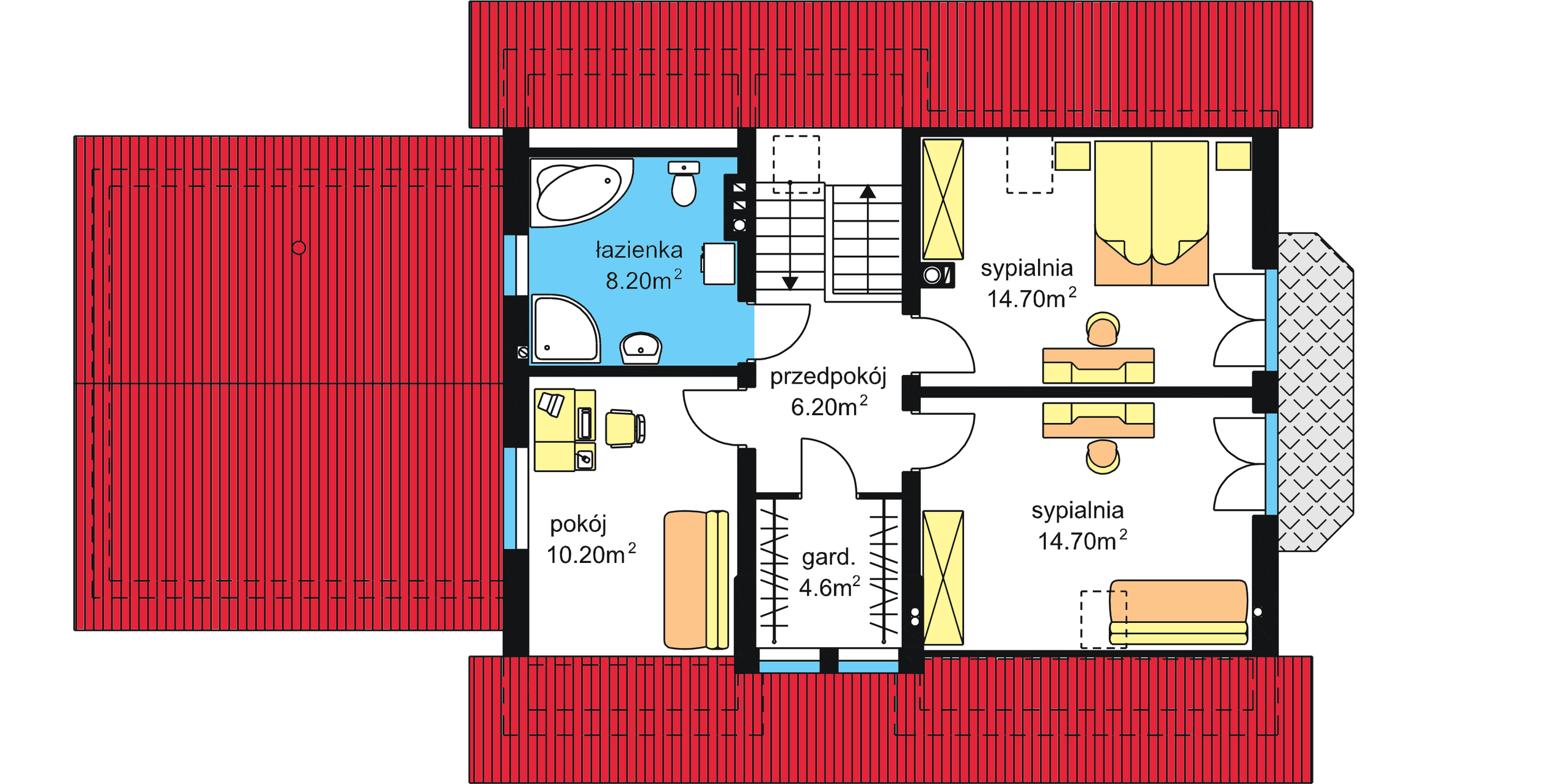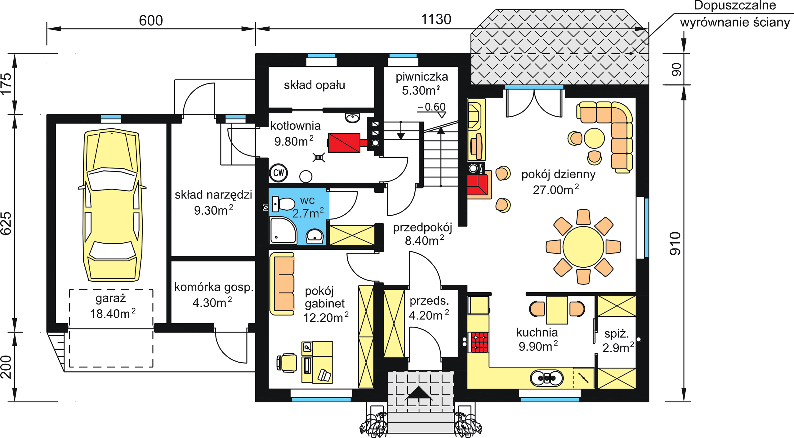 Graficzne opracowanie rzutów poglądowych widocznych na karcie projektu zostało wykonane przez Extradom.pl. Prezentowane przez Extradom.pl wizualizacje wykonane zostały przez autora projektu i należy poczytywać je jedynie za przykład i propozycję wykończenia, wizję architektoniczną autora projektu. Ostateczne wykończenie budynku może nastąpić na wiele sposobów. Szczegółowe rozwiązania zastosowane w oferowanej dokumentacji - w tym również ilość, lokalizacje i wygląd okien, drzwi, kominów - mogą w niewielkim stopniu różnić się od prezentowanej wizualizacji budynku.