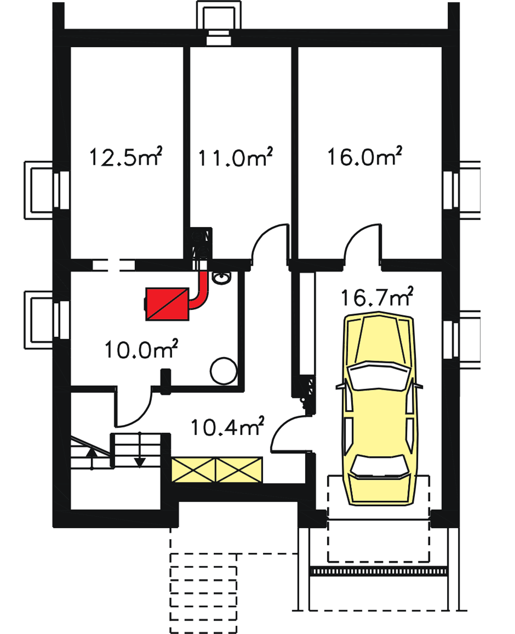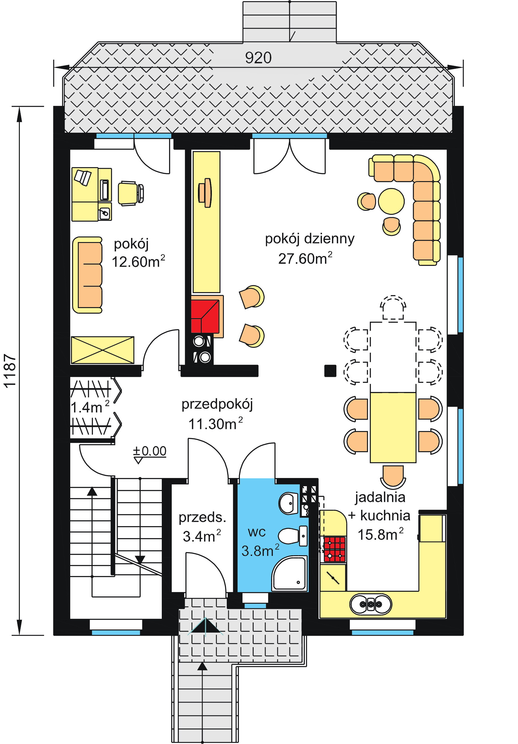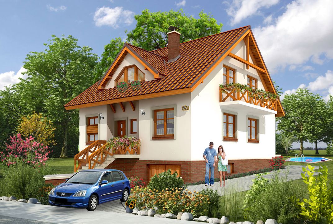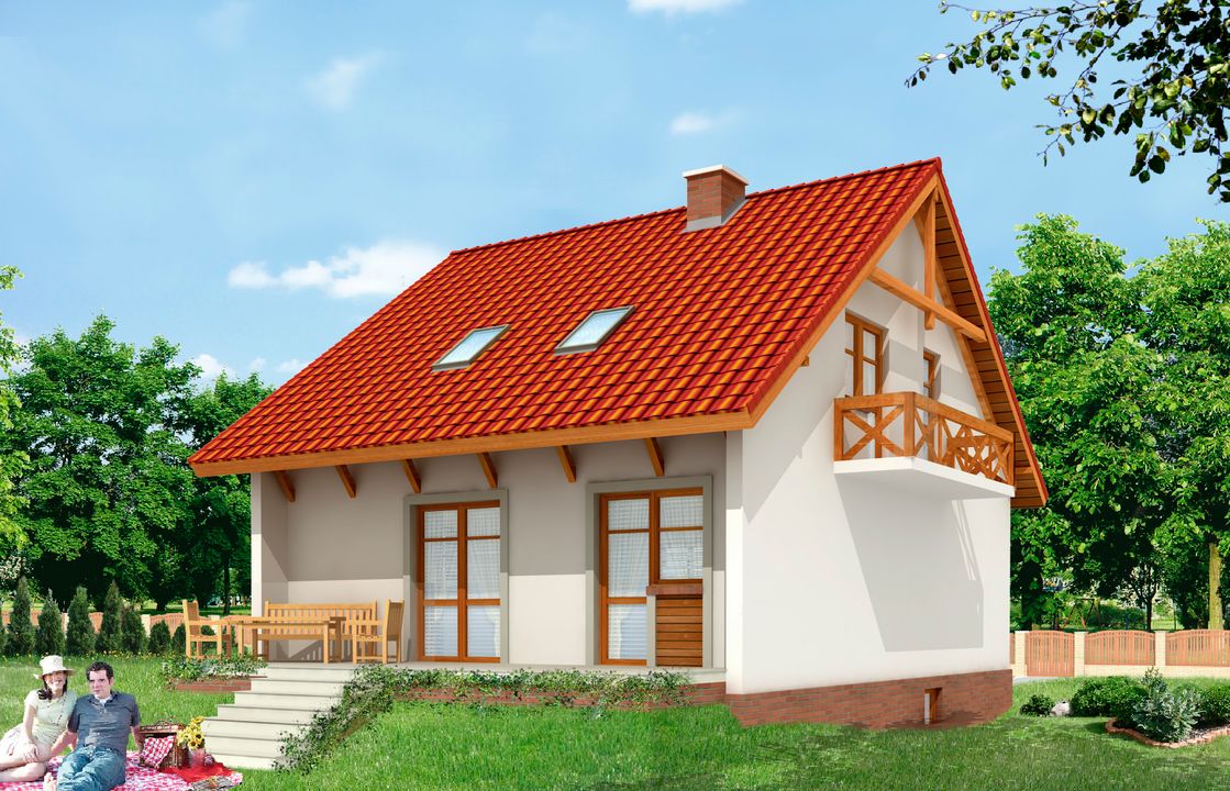 Graficzne opracowanie rzutów poglądowych widocznych na karcie projektu zostało wykonane przez Extradom.pl. Prezentowane przez Extradom.pl wizualizacje wykonane zostały przez autora projektu i należy poczytywać je jedynie za przykład i propozycję wykończenia, wizję architektoniczną autora projektu. Ostateczne wykończenie budynku może nastąpić na wiele sposobów. Szczegółowe rozwiązania zastosowane w oferowanej dokumentacji - w tym również ilość, lokalizacje i wygląd okien, drzwi, kominów - mogą w niewielkim stopniu różnić się od prezentowanej wizualizacji budynku.