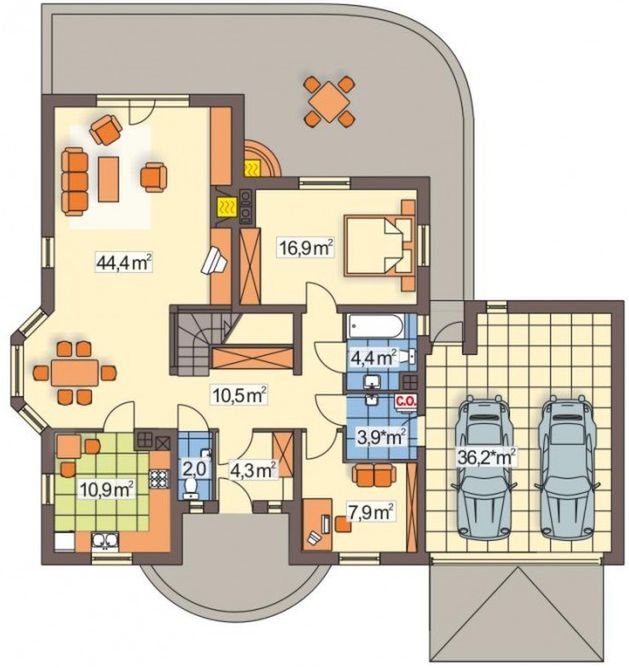 Graficzne opracowanie rzutów poglądowych widocznych na karcie projektu zostało wykonane przez Extradom.pl. Prezentowane przez Extradom.pl wizualizacje wykonane zostały przez autora projektu i należy poczytywać je jedynie za przykład i propozycję wykończenia, wizję architektoniczną autora projektu. Ostateczne wykończenie budynku może nastąpić na wiele sposobów. Szczegółowe rozwiązania zastosowane w oferowanej dokumentacji - w tym również ilość, lokalizacje i wygląd okien, drzwi, kominów - mogą w niewielkim stopniu różnić się od prezentowanej wizualizacji budynku.