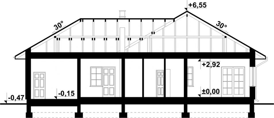 Budynek wykonany w technologii tradycyjnej. Ściany warstwowe grubości 41cm, murowane z bloczków „POROTHERM” grubości 25cm, ocieplone styropianem grubości 16cm. Ściany wewnętrzne z bloczków „POROTHERM” grubości 25cm i 12cm. Komin z cegły ceramicznej pełnej. Strop gęstożebrowy „POROTHERM”. Więźba dachowa wielospadowa, drewniana, pokryta dachówką.