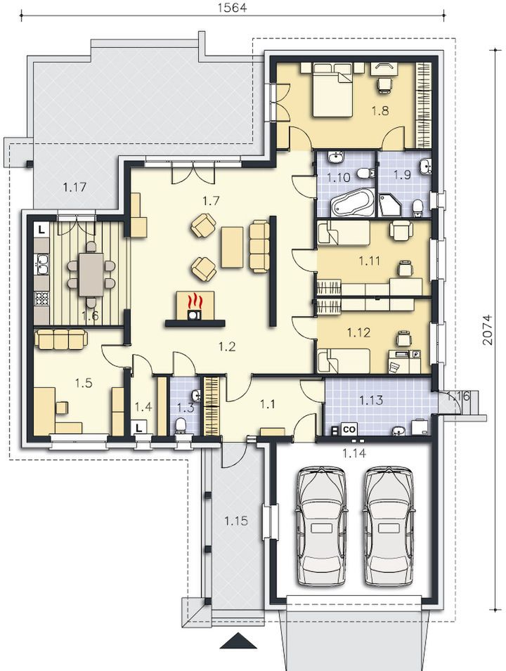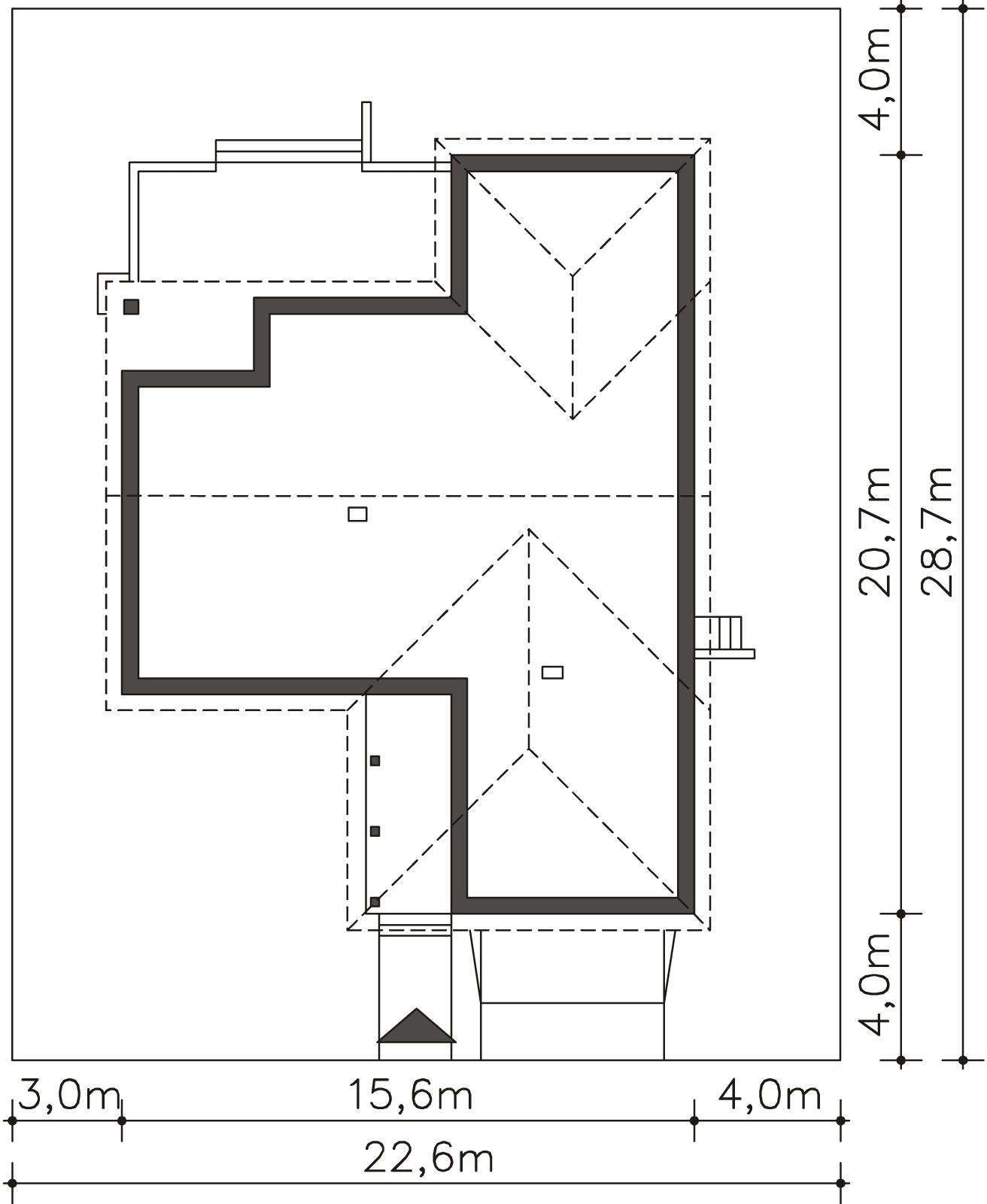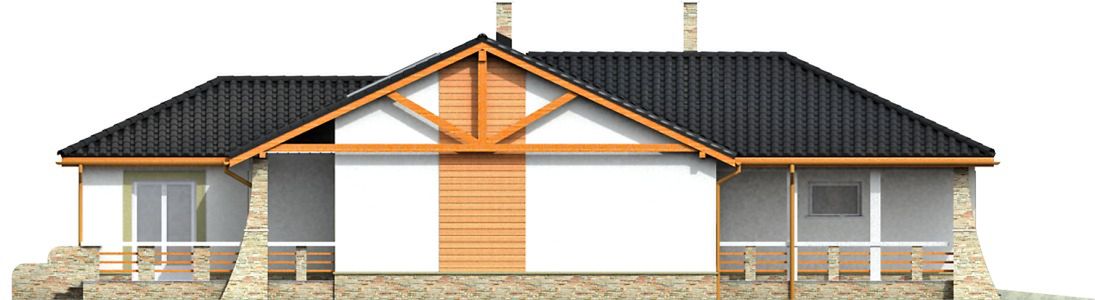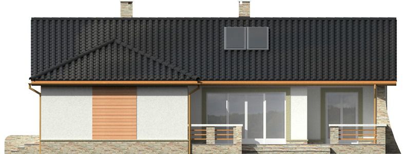 Graficzne opracowanie rzutów poglądowych widocznych na karcie projektu zostało wykonane przez Extradom.pl. Prezentowane przez Extradom.pl wizualizacje wykonane zostały przez autora projektu i należy poczytywać je jedynie za przykład i propozycję wykończenia, wizję architektoniczną autora projektu. Ostateczne wykończenie budynku może nastąpić na wiele sposobów. Szczegółowe rozwiązania zastosowane w oferowanej dokumentacji - w tym również ilość, lokalizacje i wygląd okien, drzwi, kominów - mogą w niewielkim stopniu różnić się od prezentowanej wizualizacji budynku.