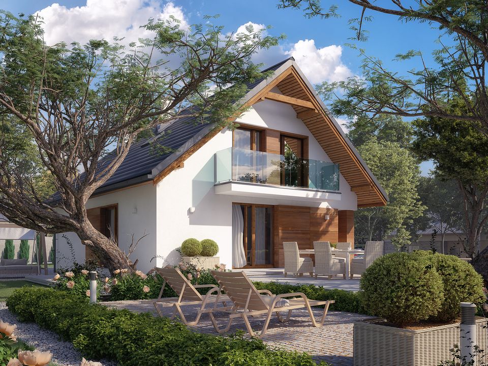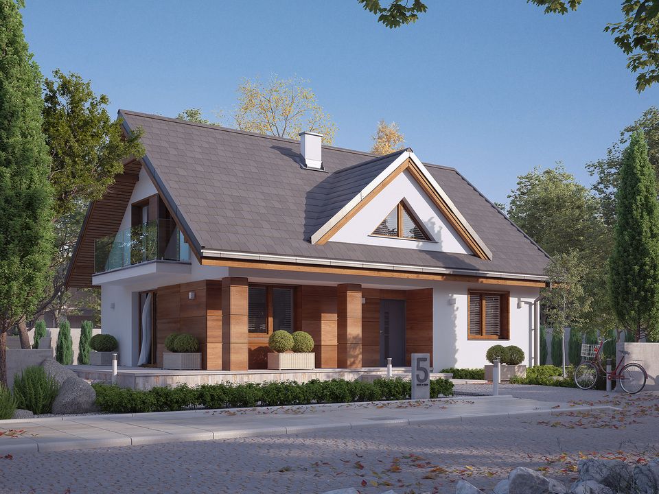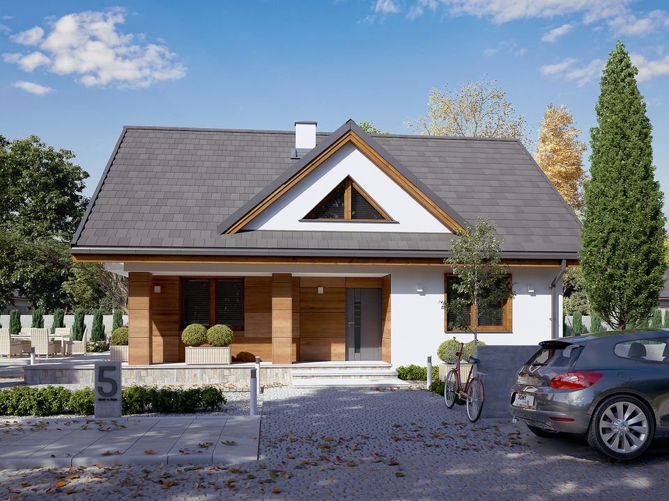 Projekt domu Wanilia to nowoczesny dom parterowy z poddaszem użytkowym, idealny dla 4- lub 5-osobowej rodziny. Charakteryzuje się regularną bryłą z dwuspadowym dachem i funkcjonalnym wnętrzem, zapewniając wygodę w codziennym użytkowaniu.