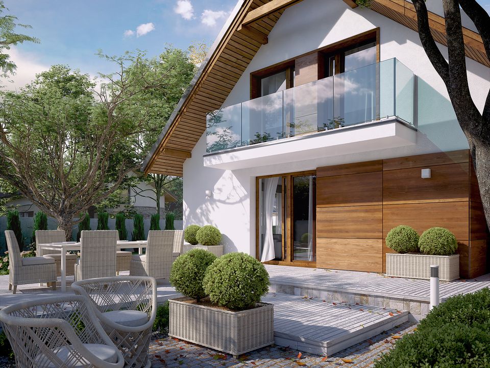 Wanilia to projekt utrzymany w nowoczesnym stylu, z prostą i ekonomiczną w budowie bryłą, którą przykrywa dwuspadowy dach. Całość zyskuje na estetyce dzięki zastosowaniu podcienia nad wejściem oraz lukarnie na poddaszu, co jednocześnie urozmaica formę i powiększa przestrzeń na piętrze. Projekt przewiduje wykorzystanie dużych przeszkleń i drewnianych akcentów na elewacji, które nadają budynkowi ciepły i przytulny, a zarazem elegancki charakter.