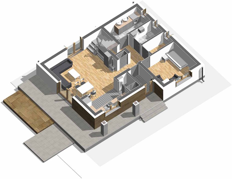 Dom Wanilia oferuje 110,96 m² powierzchni użytkowej, na której zaprojektowano łącznie 4 pokoje oraz dwie łazienki. Przemyślany układ dzieli dom na wyraźne strefy.