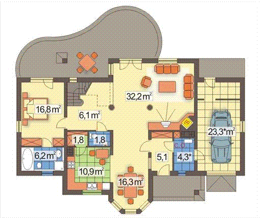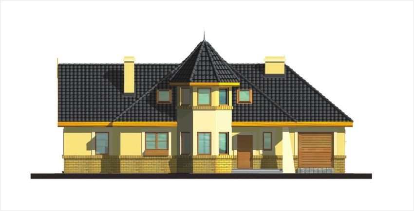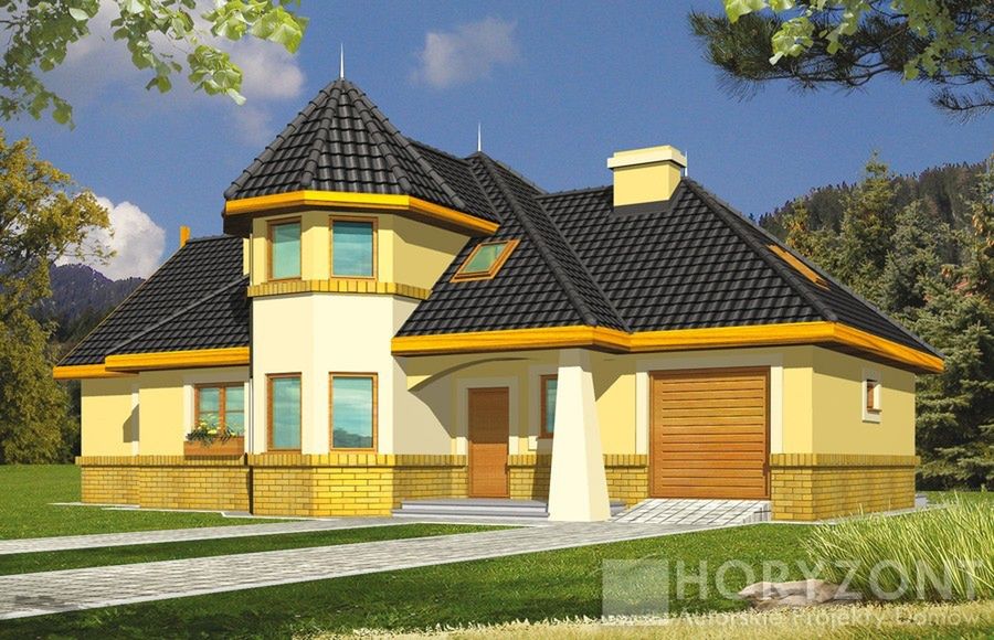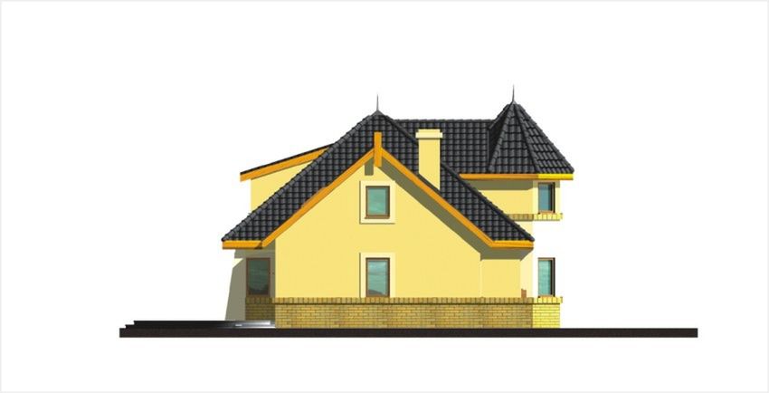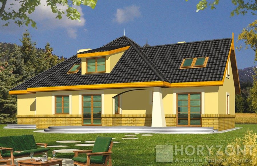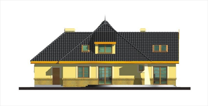 Graficzne opracowanie rzutów poglądowych widocznych na karcie projektu zostało wykonane przez Extradom.pl. Prezentowane przez Extradom.pl wizualizacje wykonane zostały przez autora projektu i należy poczytywać je jedynie za przykład i propozycję wykończenia, wizję architektoniczną autora projektu. Ostateczne wykończenie budynku może nastąpić na wiele sposobów. Szczegółowe rozwiązania zastosowane w oferowanej dokumentacji - w tym również ilość, lokalizacje i wygląd okien, drzwi, kominów - mogą w niewielkim stopniu różnić się od prezentowanej wizualizacji budynku.