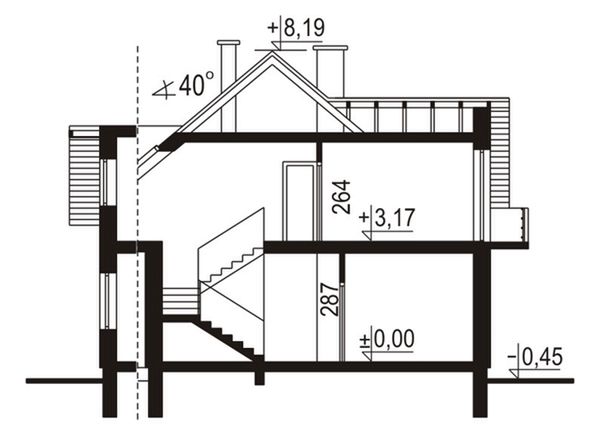 Ściany zewnętrzne: gr. 44 cm z pustaków ceramicznych POROTHERM. Strop: POROTHERM. Schody: żelbetowe. Dach: czterospadowy o nachyleniu 40 stopni, kryty dachówką ceramiczną KORAMIC. Poziom kalenicy: 8,64 m od terenu. Dodatkowe informacje: ogrzewanie: kocioł gazowy jednofunkcyjny z zasobnikiem c.w.u..