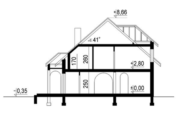 Ściany zewnętrzne: grubość 38,0 cm - pustak ceramiczny + wełna mineralna. Strop: FERT. Schody: żelbetowe. Dach: dwuspadowy o nachyleniu 41 stopni, więźba krokwiowo-jętkowa, krycie dachówką cementową BRAAS. Poziom kalenicy: 9,01 m od terenu.