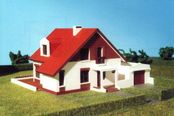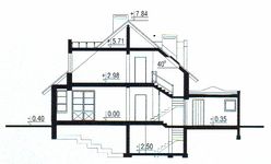Ściany zewnętrzne: gr. 38 cm z pustaków ceramicznych + styropian. Strop: Fert 40, nad poddaszem drewniany. Nad garażem stropodach na płycie żelbetowej monolitycznej. Schody: żelbetowe. Dach: dwuspadowy o kacie nachylenia 40 stopni, kryty dachówką bitumiczną lub blachą dachówkową. Poziom kalenicy: 8,24 m od terenu. Dodatkowe informacje: W poziomie piwnic pomieszczenia techniczno-gospodarcze..