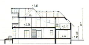 Ściany zewnętrzne: gr. 38 cm z pustaków ceramicznych + styropian. Strop: Fert 40, nad poddaszem drewniany, nad garażem plyta monolityczna żelbetowa. Schody: drewniane. Dach: dwuspadowy o kącie nachylenia 45 stopni, kryty dachówką ceramiczną lub blachą dachówkową. Poziom kalenicy: 8,27 m od terenu.