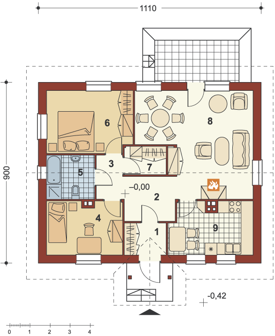 Graficzne opracowanie rzutów poglądowych widocznych na karcie projektu zostało wykonane przez Extradom.pl. Prezentowane przez Extradom.pl wizualizacje wykonane zostały przez autora projektu i należy poczytywać je jedynie za przykład i propozycję wykończenia, wizję architektoniczną autora projektu. Ostateczne wykończenie budynku może nastąpić na wiele sposobów. Szczegółowe rozwiązania zastosowane w oferowanej dokumentacji - w tym również ilość, lokalizacje i wygląd okien, drzwi, kominów - mogą w niewielkim stopniu różnić się od prezentowanej wizualizacji budynku.