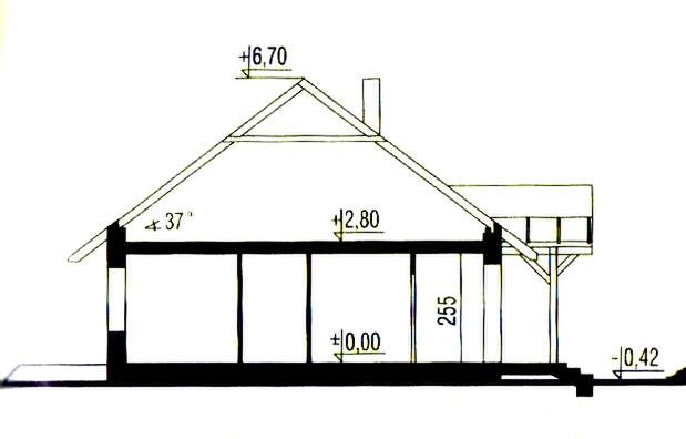 Ściany zewnętrzne: gr. 40 cm z pustak ceramiczny + styropian. Strop: drewniany. Schody: strychowe wysuwane. Dach: dwuspadowy o nachyleniu 37 stopni, więźba krokwiowo-jętkowa, krycie dachówką bitumiczną. Poziom kalenicy: 7,15 m od ternu.