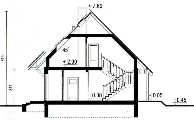 Ściany zewnętrzne: gr. 34cm: pustak YTONG + styropian. Strop: drewniany. Schody: drewniane, policzkowe. Dach: dwuspadowy o nachyleniu 45 stopni z naczółkami, więźba drewniana, krycie blachą stalową powlekaną imitującą dachówkę. Poziom kalenicy: 8,14 m od terenu.