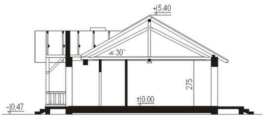 Ściany zewnętrzne: gr. 38,0 cm: pustaki PORTHERM typu pióro-wpust na zaprawie ciepłej perlitowej. Strop: drewniany, belki stropu oparte na podciądu podwieszonym do wieszara dachowego. Dach: dwuspadowy o nachyleniu 30 stopni, więźba drewniana o układzie wieszarowym, krycie płytami bitumicznymi ONDULINE, po adaptacji więźby możliwość zastosowania dachówki cementowej. Poziom kalenicy: od terenu 5,87 m.