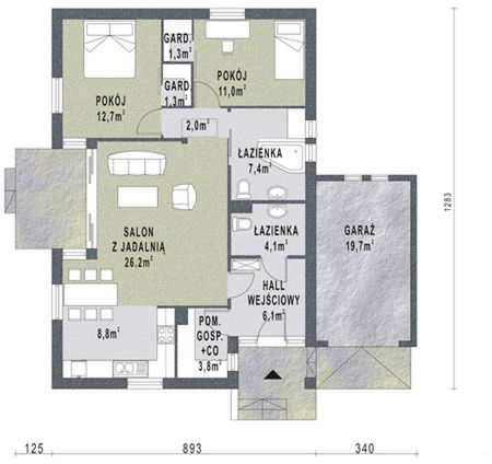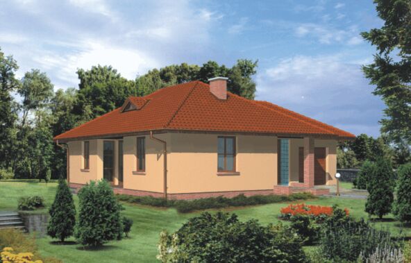 Graficzne opracowanie rzutów poglądowych widocznych na karcie projektu zostało wykonane przez Extradom.pl. Prezentowane przez Extradom.pl wizualizacje wykonane zostały przez autora projektu i należy poczytywać je jedynie za przykład i propozycję wykończenia, wizję architektoniczną autora projektu. Ostateczne wykończenie budynku może nastąpić na wiele sposobów. Szczegółowe rozwiązania zastosowane w oferowanej dokumentacji - w tym również ilość, lokalizacje i wygląd okien, drzwi, kominów - mogą w niewielkim stopniu różnić się od prezentowanej wizualizacji budynku.