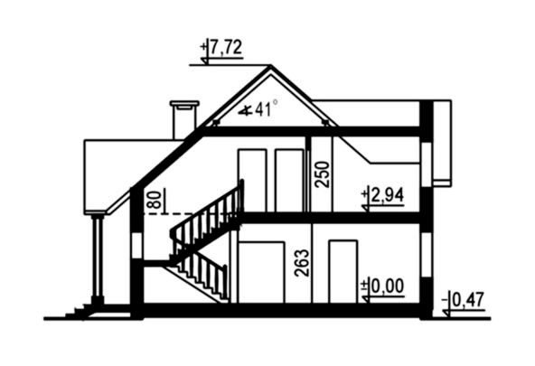 Ściany zewnętrzne: gr. 38 cm z pustaków ceramicznych POROTHERM. Strop: TERIVA. Schody: żelbetowe. Dach: dwuspadowy o nachyleniu 41 stopni, więźba krokwiowo-płatwiowa, krycie dachówką. Poziom kalenicy: 8,20 m od terenu. Dodatkowe informacje: taras: 29,20 m kw.