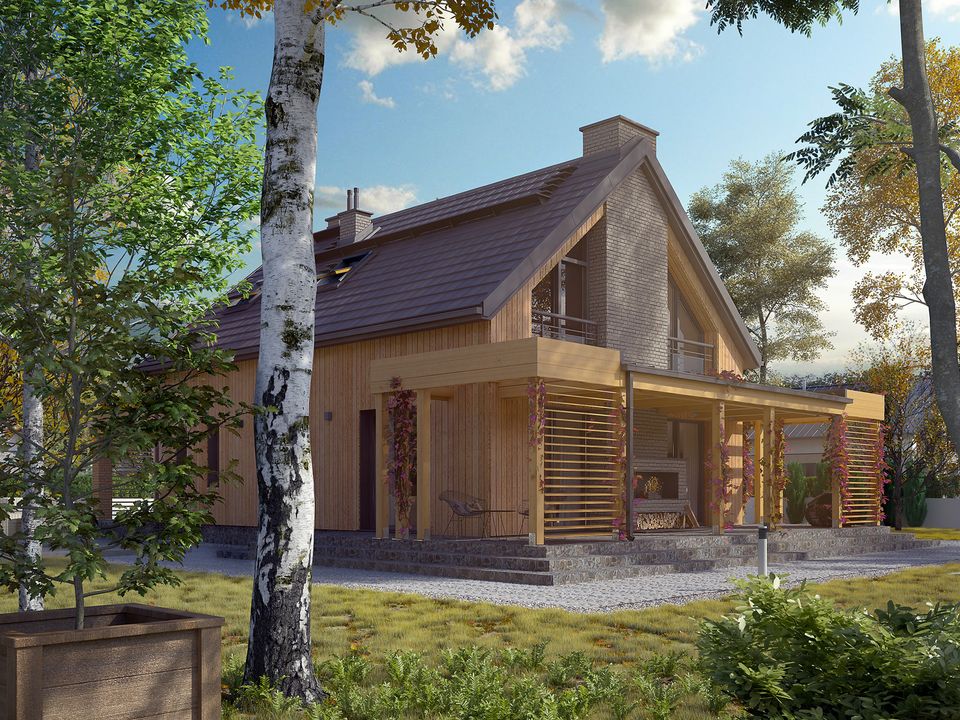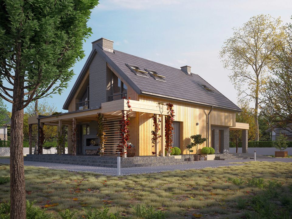 Graficzne opracowanie rzutów poglądowych widocznych na karcie projektu zostało wykonane przez Extradom.pl. Prezentowane przez Extradom.pl wizualizacje wykonane zostały przez autora projektu i należy poczytywać je jedynie za przykład i propozycję wykończenia, wizję architektoniczną autora projektu. Ostateczne wykończenie budynku może nastąpić na wiele sposobów. Szczegółowe rozwiązania zastosowane w oferowanej dokumentacji - w tym również ilość, lokalizacje i wygląd okien, drzwi, kominów - mogą w niewielkim stopniu różnić się od prezentowanej wizualizacji budynku.