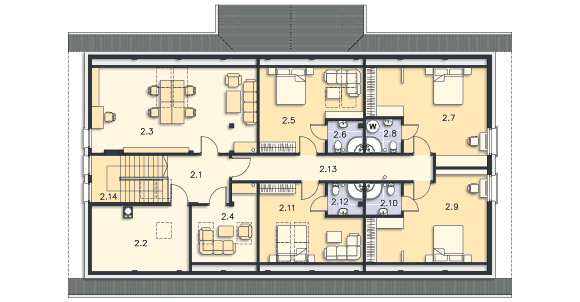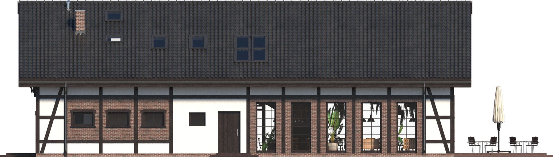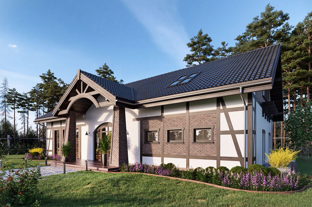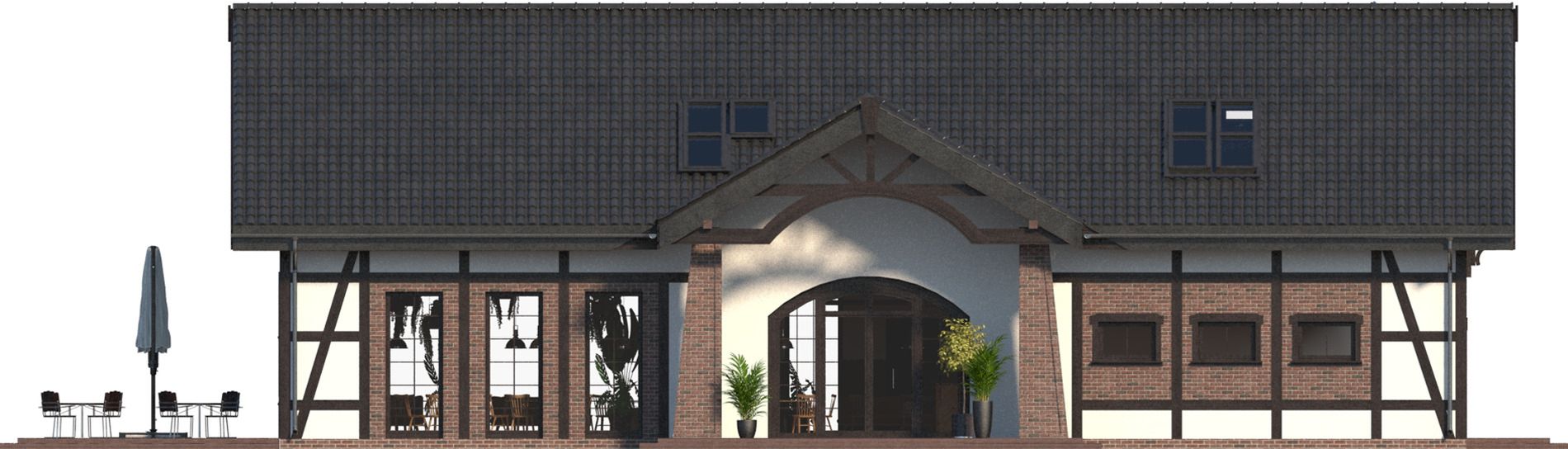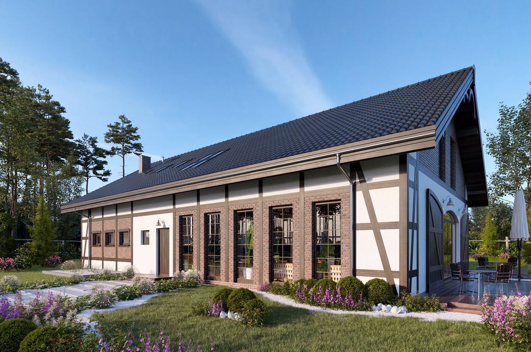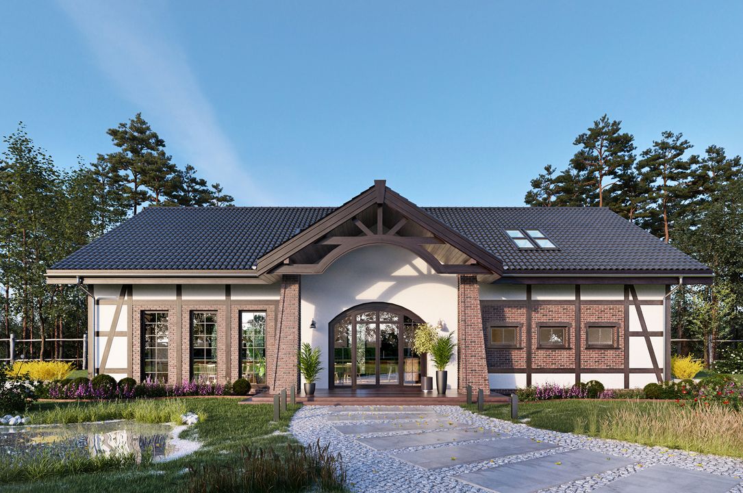Graficzne opracowanie rzutów poglądowych widocznych na karcie projektu zostało wykonane przez Extradom.pl. Prezentowane przez Extradom.pl wizualizacje wykonane zostały przez autora projektu i należy poczytywać je jedynie za przykład i propozycję wykończenia, wizję architektoniczną autora projektu. Ostateczne wykończenie budynku może nastąpić na wiele sposobów. Szczegółowe rozwiązania zastosowane w oferowanej dokumentacji - w tym również ilość, lokalizacje i wygląd okien, drzwi, kominów - mogą w niewielkim stopniu różnić się od prezentowanej wizualizacji budynku.