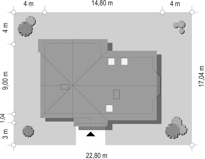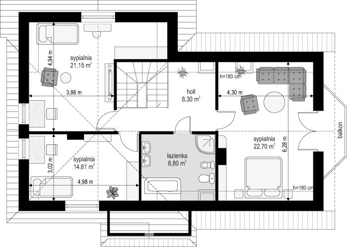Fundamenty: betonowe. Ściany: trójwarstwowe: gazobeton + wełna mineralna. Strop: Teriva lub monolityczny żelbetowydachówka ceramiczna lub blachodachówka. Nachylenie dachu: 45 stopni.