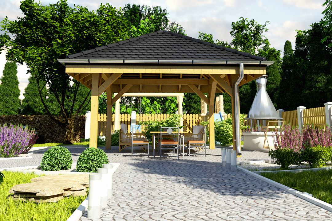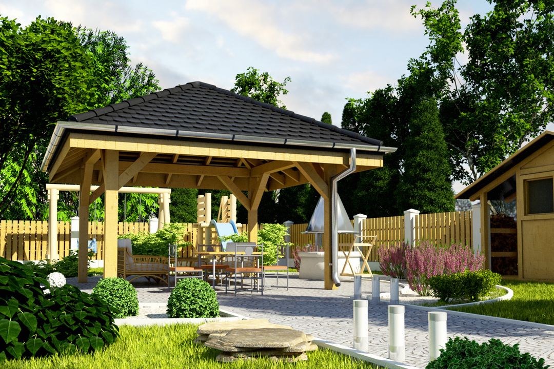 Ściany w technologii drewnianej z czterospadowym dachem, pokrytym dachówką ceramiczną. Dostępna w różnych rozmiarach rozpiętościowych podanych przy rysunku rzutu.