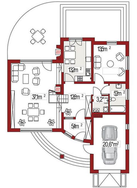 Graficzne opracowanie rzutów poglądowych widocznych na karcie projektu zostało wykonane przez Extradom.pl. Prezentowane przez Extradom.pl wizualizacje wykonane zostały przez autora projektu i należy poczytywać je jedynie za przykład i propozycję wykończenia, wizję architektoniczną autora projektu. Ostateczne wykończenie budynku może nastąpić na wiele sposobów. Szczegółowe rozwiązania zastosowane w oferowanej dokumentacji - w tym również ilość, lokalizacje i wygląd okien, drzwi, kominów - mogą w niewielkim stopniu różnić się od prezentowanej wizualizacji budynku.