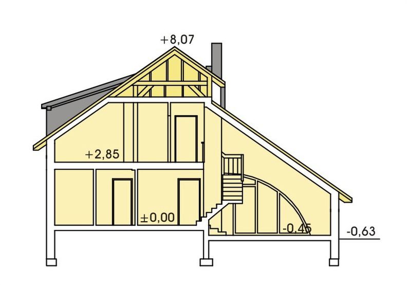 Strop: gęstożebrowy Teriva I. Ściany zewnętrzne: gazobeton 24cm + styropian 12cm. Ściany wewnętrzne: bloczki gazobetonowe 24cm. Pokrycie dachowe: dachówka ceramiczna. Ogrzewanie: gaz.