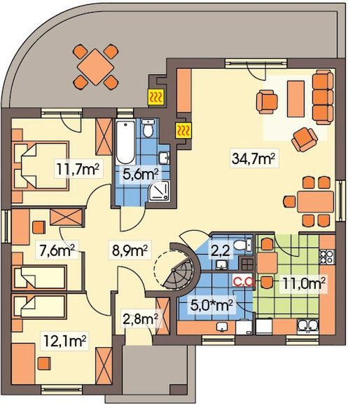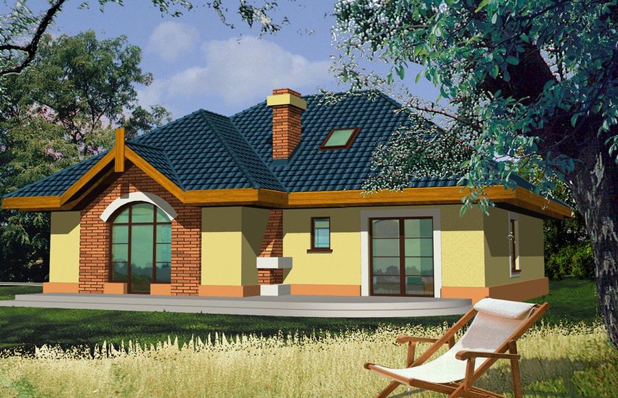 Graficzne opracowanie rzutów poglądowych widocznych na karcie projektu zostało wykonane przez Extradom.pl. Prezentowane przez Extradom.pl wizualizacje wykonane zostały przez autora projektu i należy poczytywać je jedynie za przykład i propozycję wykończenia, wizję architektoniczną autora projektu. Ostateczne wykończenie budynku może nastąpić na wiele sposobów. Szczegółowe rozwiązania zastosowane w oferowanej dokumentacji - w tym również ilość, lokalizacje i wygląd okien, drzwi, kominów - mogą w niewielkim stopniu różnić się od prezentowanej wizualizacji budynku.