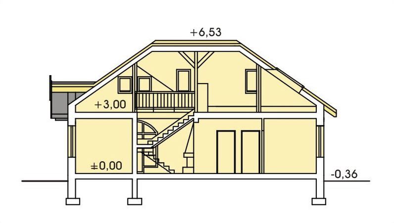 Strop: gęstożebrowy Teriva I. Ściany zewnętrzne: gazobeton 36,5cm. Pokrycie dachowe: dachówka ceramiczna. Ogrzewanie: gaz. Okna połaciowe: Velux.