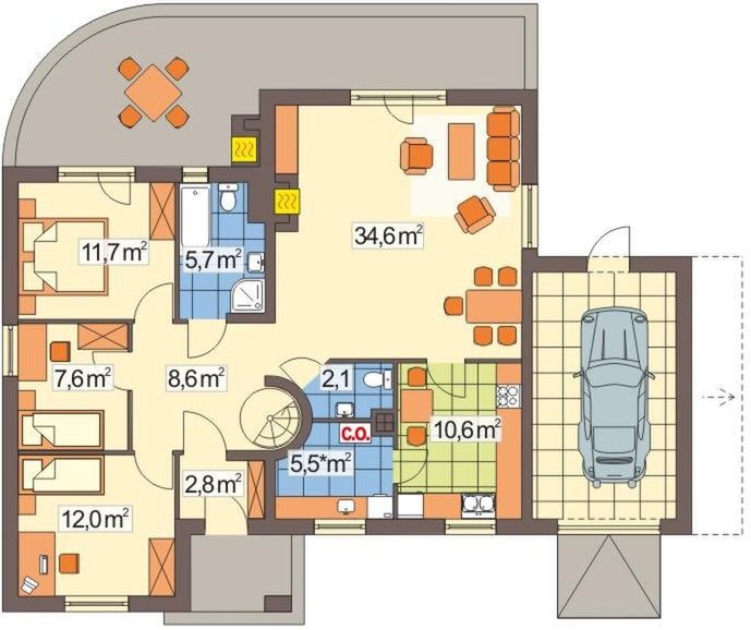 Graficzne opracowanie rzutów poglądowych widocznych na karcie projektu zostało wykonane przez Extradom.pl. Prezentowane przez Extradom.pl wizualizacje wykonane zostały przez autora projektu i należy poczytywać je jedynie za przykład i propozycję wykończenia, wizję architektoniczną autora projektu. Ostateczne wykończenie budynku może nastąpić na wiele sposobów. Szczegółowe rozwiązania zastosowane w oferowanej dokumentacji - w tym również ilość, lokalizacje i wygląd okien, drzwi, kominów - mogą w niewielkim stopniu różnić się od prezentowanej wizualizacji budynku.