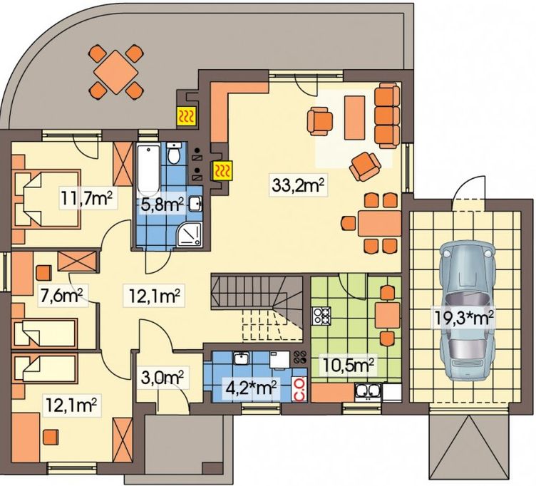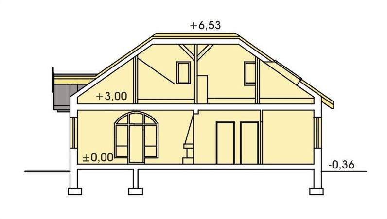 Graficzne opracowanie rzutów poglądowych widocznych na karcie projektu zostało wykonane przez Extradom.pl. Prezentowane przez Extradom.pl wizualizacje wykonane zostały przez autora projektu i należy poczytywać je jedynie za przykład i propozycję wykończenia, wizję architektoniczną autora projektu. Ostateczne wykończenie budynku może nastąpić na wiele sposobów. Szczegółowe rozwiązania zastosowane w oferowanej dokumentacji - w tym również ilość, lokalizacje i wygląd okien, drzwi, kominów - mogą w niewielkim stopniu różnić się od prezentowanej wizualizacji budynku.