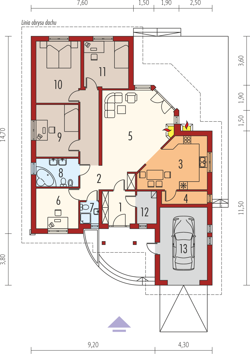 Graficzne opracowanie rzutów poglądowych widocznych na karcie projektu zostało wykonane przez Extradom.pl. Prezentowane przez Extradom.pl wizualizacje wykonane zostały przez autora projektu i należy poczytywać je jedynie za przykład i propozycję wykończenia, wizję architektoniczną autora projektu. Ostateczne wykończenie budynku może nastąpić na wiele sposobów. Szczegółowe rozwiązania zastosowane w oferowanej dokumentacji - w tym również ilość, lokalizacje i wygląd okien, drzwi, kominów - mogą w niewielkim stopniu różnić się od prezentowanej wizualizacji budynku.