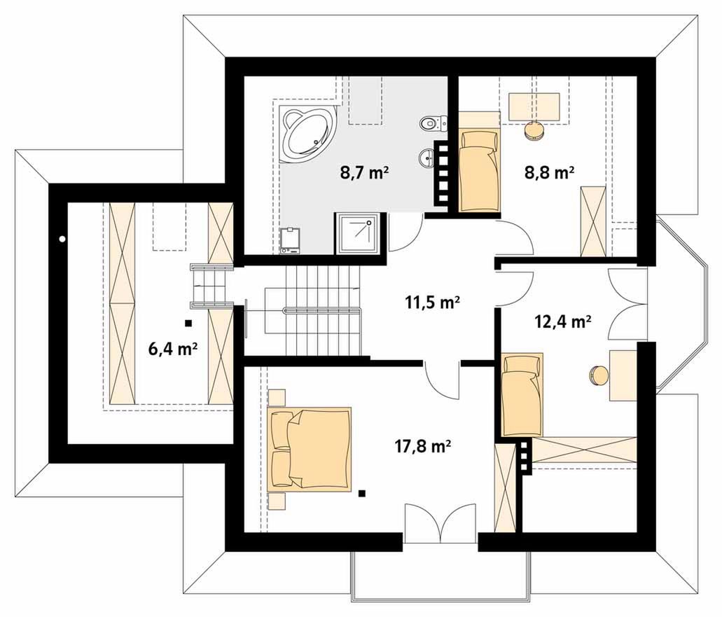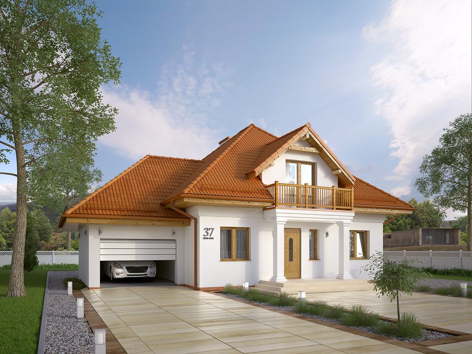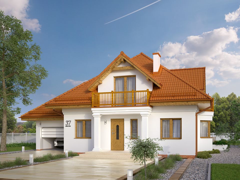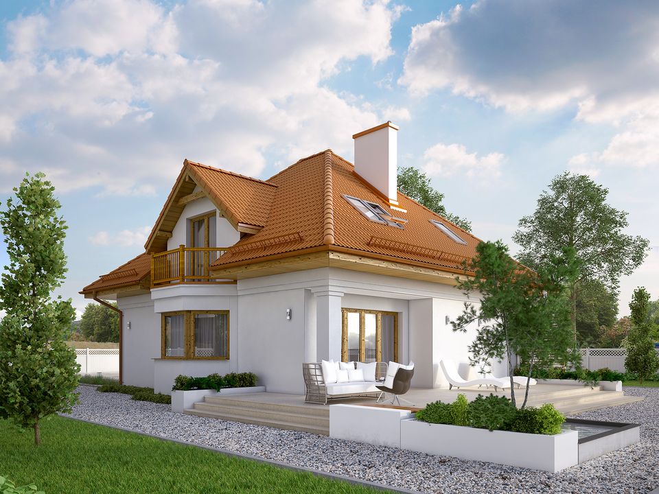 Graficzne opracowanie rzutów poglądowych widocznych na karcie projektu zostało wykonane przez Extradom.pl. Prezentowane przez Extradom.pl wizualizacje wykonane zostały przez autora projektu i należy poczytywać je jedynie za przykład i propozycję wykończenia, wizję architektoniczną autora projektu. Ostateczne wykończenie budynku może nastąpić na wiele sposobów. Szczegółowe rozwiązania zastosowane w oferowanej dokumentacji - w tym również ilość, lokalizacje i wygląd okien, drzwi, kominów - mogą w niewielkim stopniu różnić się od prezentowanej wizualizacji budynku.