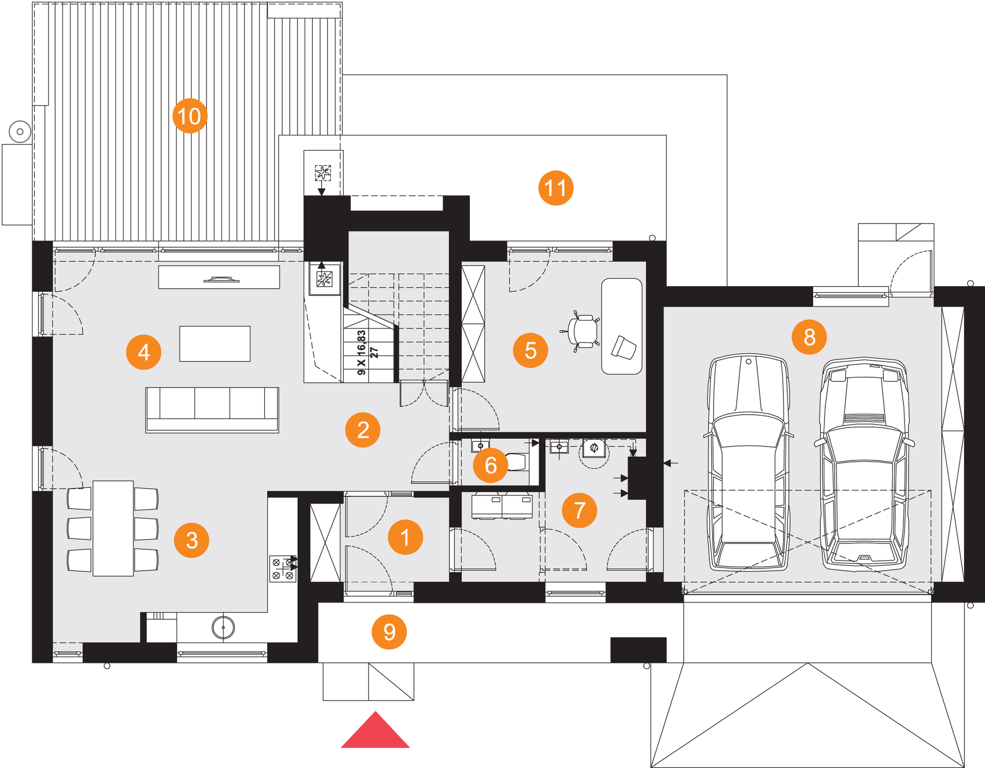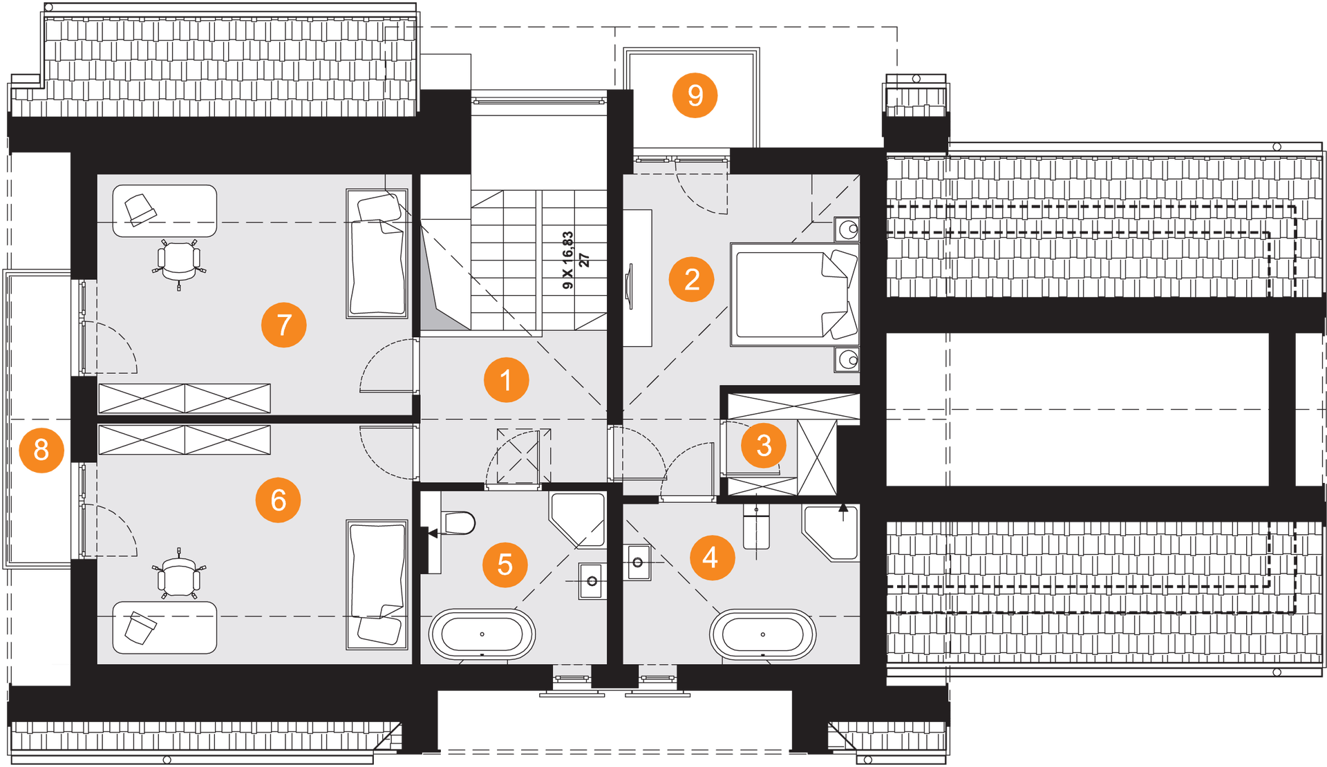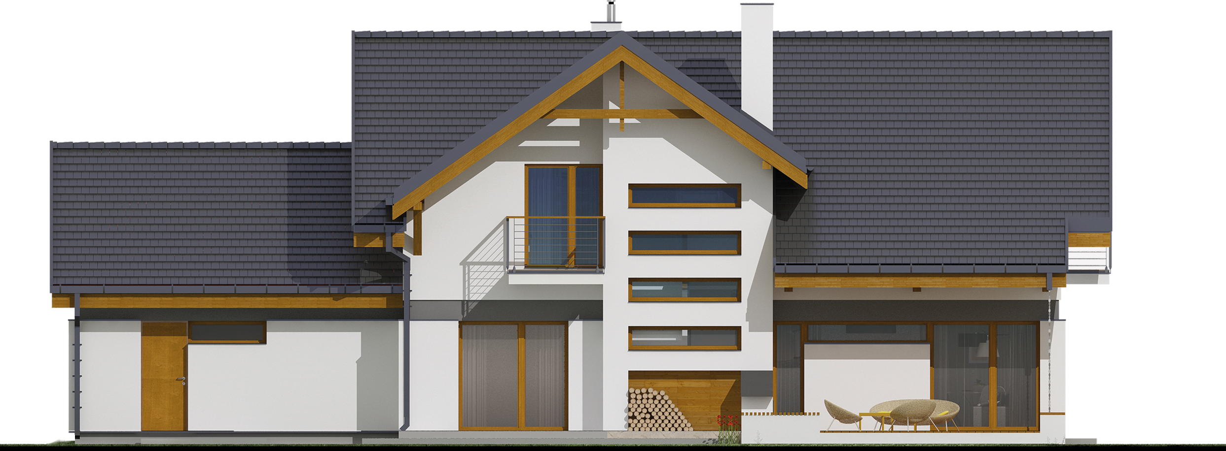 Graficzne opracowanie rzutów poglądowych widocznych na karcie projektu zostało wykonane przez Extradom.pl. Prezentowane przez Extradom.pl wizualizacje wykonane zostały przez autora projektu i należy poczytywać je jedynie za przykład i propozycję wykończenia, wizję architektoniczną autora projektu. Ostateczne wykończenie budynku może nastąpić na wiele sposobów. Szczegółowe rozwiązania zastosowane w oferowanej dokumentacji - w tym również ilość, lokalizacje i wygląd okien, drzwi, kominów - mogą w niewielkim stopniu różnić się od prezentowanej wizualizacji budynku.
