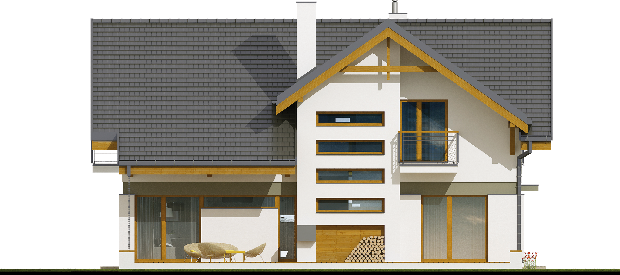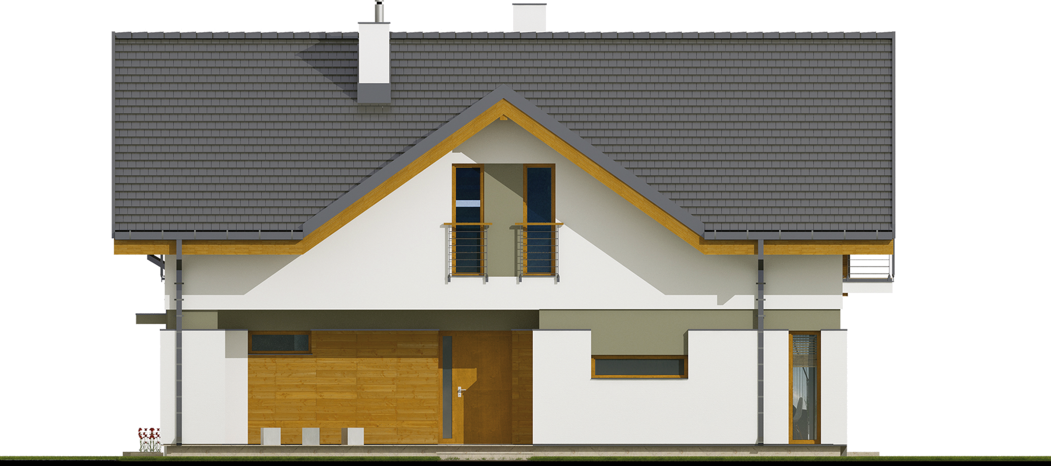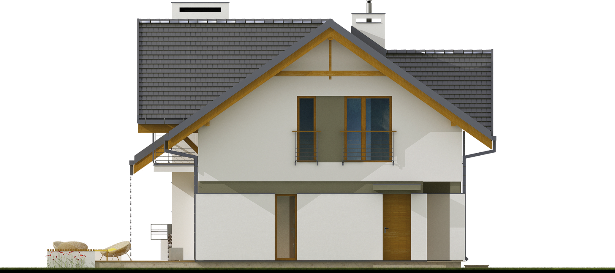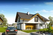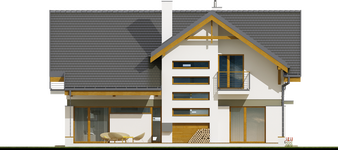 Graficzne opracowanie rzutów poglądowych widocznych na karcie projektu zostało wykonane przez Extradom.pl. Prezentowane przez Extradom.pl wizualizacje wykonane zostały przez autora projektu i należy poczytywać je jedynie za przykład i propozycję wykończenia, wizję architektoniczną autora projektu. Ostateczne wykończenie budynku może nastąpić na wiele sposobów. Szczegółowe rozwiązania zastosowane w oferowanej dokumentacji - w tym również ilość, lokalizacje i wygląd okien, drzwi, kominów - mogą w niewielkim stopniu różnić się od prezentowanej wizualizacji budynku.