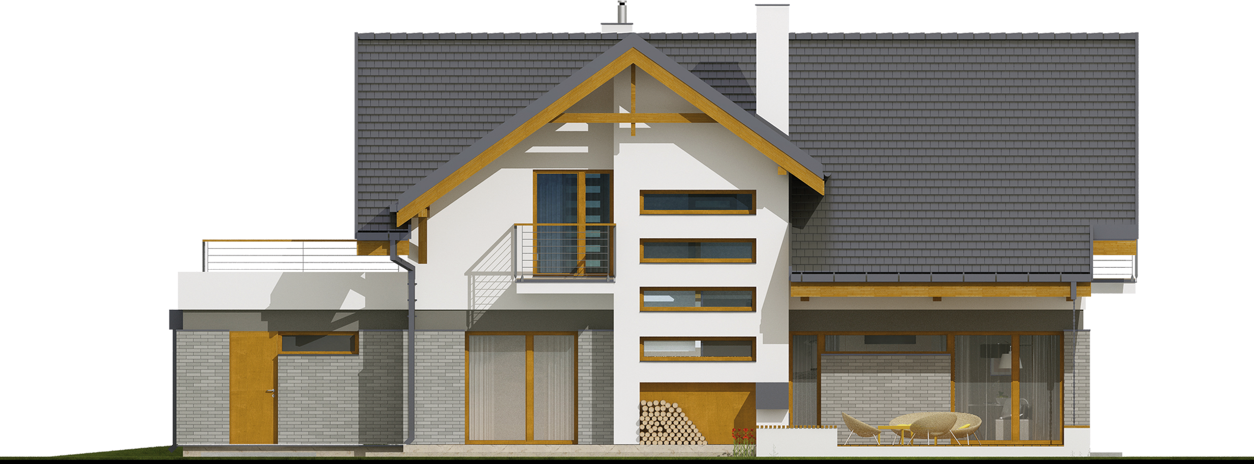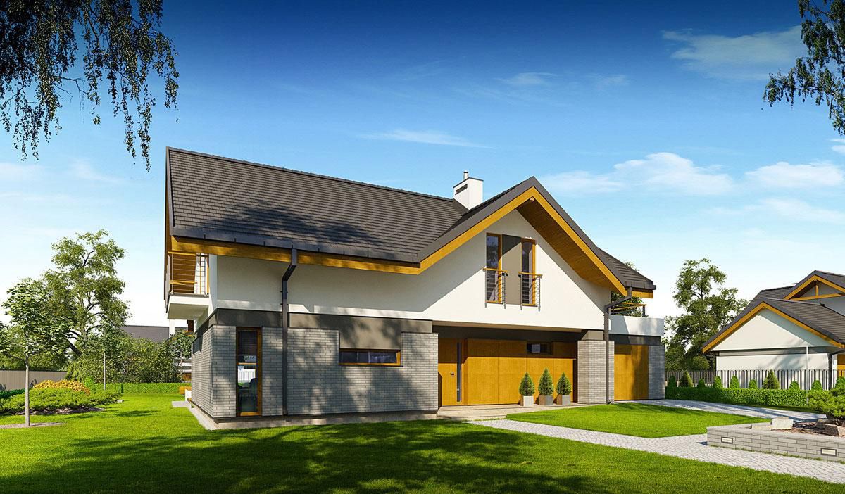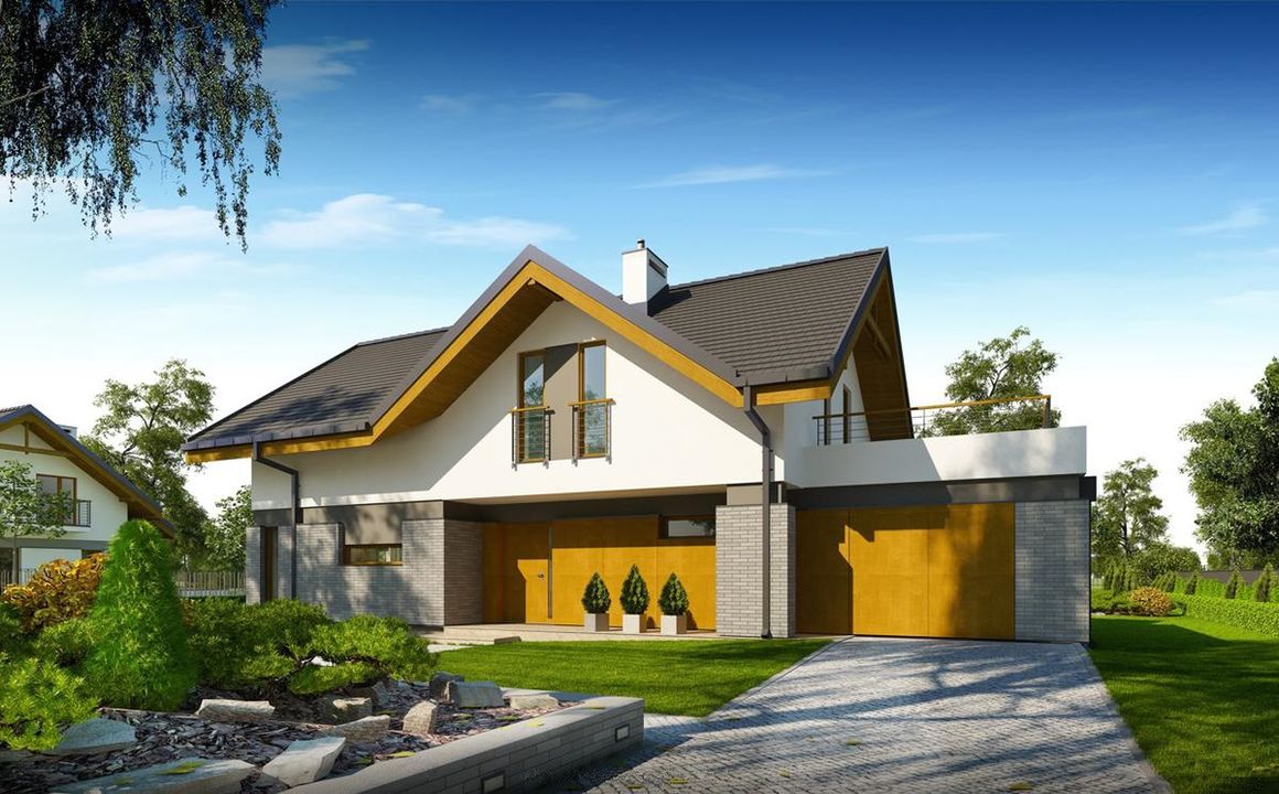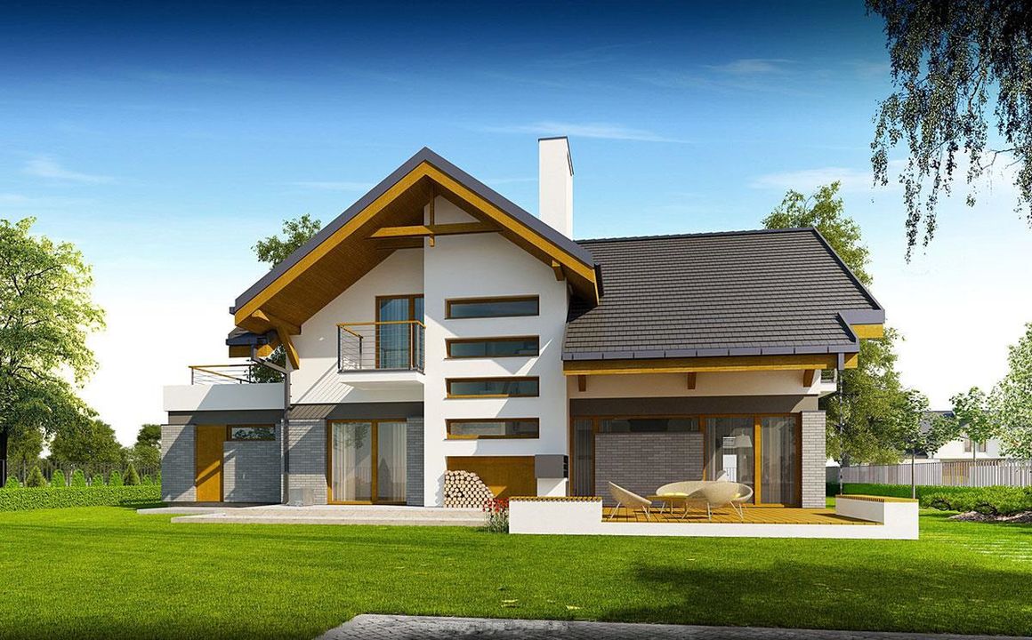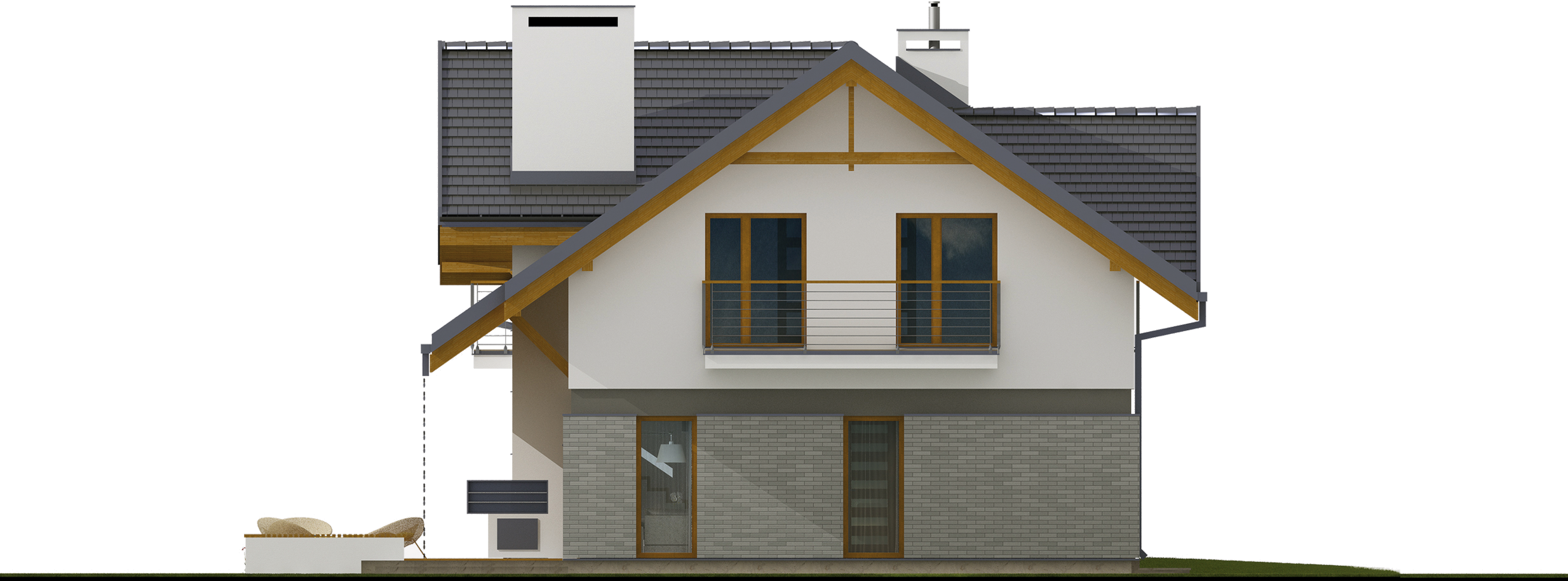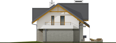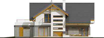 Graficzne opracowanie rzutów poglądowych widocznych na karcie projektu zostało wykonane przez Extradom.pl. Prezentowane przez Extradom.pl wizualizacje wykonane zostały przez autora projektu i należy poczytywać je jedynie za przykład i propozycję wykończenia, wizję architektoniczną autora projektu. Ostateczne wykończenie budynku może nastąpić na wiele sposobów. Szczegółowe rozwiązania zastosowane w oferowanej dokumentacji - w tym również ilość, lokalizacje i wygląd okien, drzwi, kominów - mogą w niewielkim stopniu różnić się od prezentowanej wizualizacji budynku.