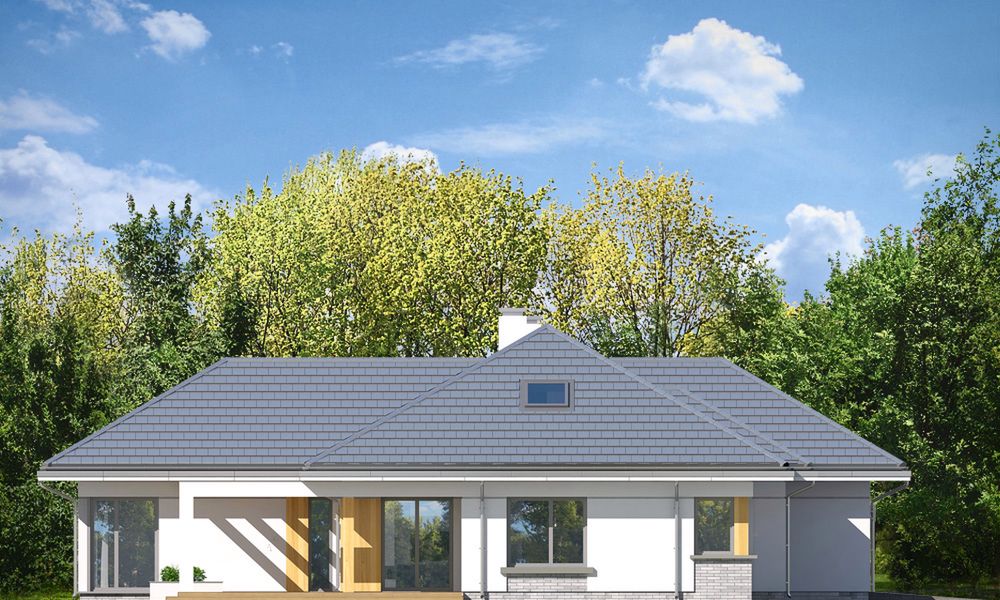 Willa Parterowa charakteryzuje się rozłożystą, parterową bryłą utrzymaną w tradycyjnym stylu. Całość przykrywa elegancki dach wielospadowy z klasycznym okapem, co nadaje budynkowi ponadczasowy charakter. Uwagę zwraca wysunięty do przodu dwustanowiskowy garaż, który tworzy praktyczne zadaszenie nad wejściem w formie podcienia. Duże przeszklenia otwierają wnętrze na otoczenie, a płynne przejście na taras zaprasza do spędzania czasu na świeżym powietrzu.