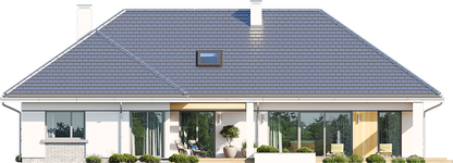 Graficzne opracowanie rzutów poglądowych widocznych na karcie projektu zostało wykonane przez Extradom.pl. Prezentowane przez Extradom.pl wizualizacje wykonane zostały przez autora projektu i należy poczytywać je jedynie za przykład i propozycję wykończenia, wizję architektoniczną autora projektu. Ostateczne wykończenie budynku może nastąpić na wiele sposobów. Szczegółowe rozwiązania zastosowane w oferowanej dokumentacji - w tym również ilość, lokalizacje i wygląd okien, drzwi, kominów - mogą w niewielkim stopniu różnić się od prezentowanej wizualizacji budynku.