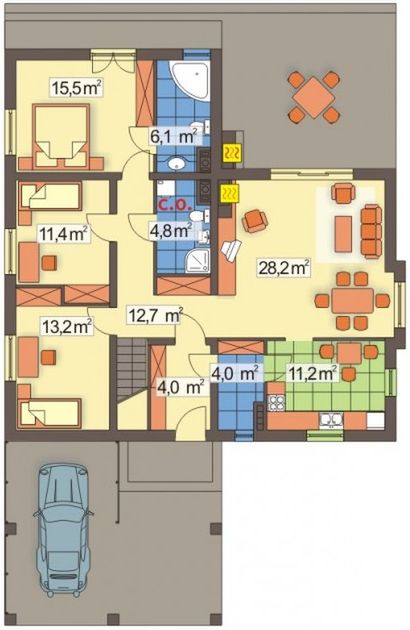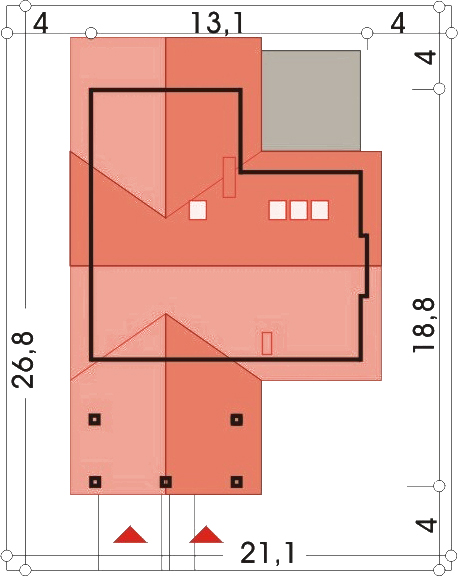 Graficzne opracowanie rzutów poglądowych widocznych na karcie projektu zostało wykonane przez Extradom.pl. Prezentowane przez Extradom.pl wizualizacje wykonane zostały przez autora projektu i należy poczytywać je jedynie za przykład i propozycję wykończenia, wizję architektoniczną autora projektu. Ostateczne wykończenie budynku może nastąpić na wiele sposobów. Szczegółowe rozwiązania zastosowane w oferowanej dokumentacji - w tym również ilość, lokalizacje i wygląd okien, drzwi, kominów - mogą w niewielkim stopniu różnić się od prezentowanej wizualizacji budynku.