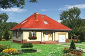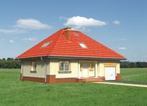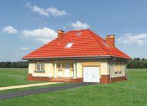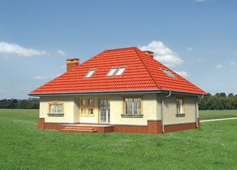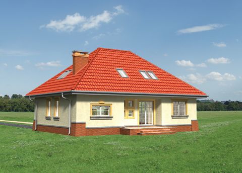Graficzne opracowanie rzutów poglądowych widocznych na karcie projektu zostało wykonane przez Extradom.pl. Prezentowane przez Extradom.pl wizualizacje wykonane zostały przez autora projektu i należy poczytywać je jedynie za przykład i propozycję wykończenia, wizję architektoniczną autora projektu. Ostateczne wykończenie budynku może nastąpić na wiele sposobów. Szczegółowe rozwiązania zastosowane w oferowanej dokumentacji - w tym również ilość, lokalizacje i wygląd okien, drzwi, kominów - mogą w niewielkim stopniu różnić się od prezentowanej wizualizacji budynku.