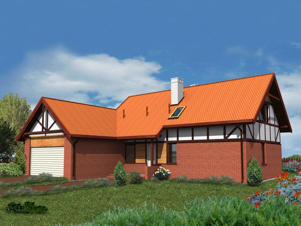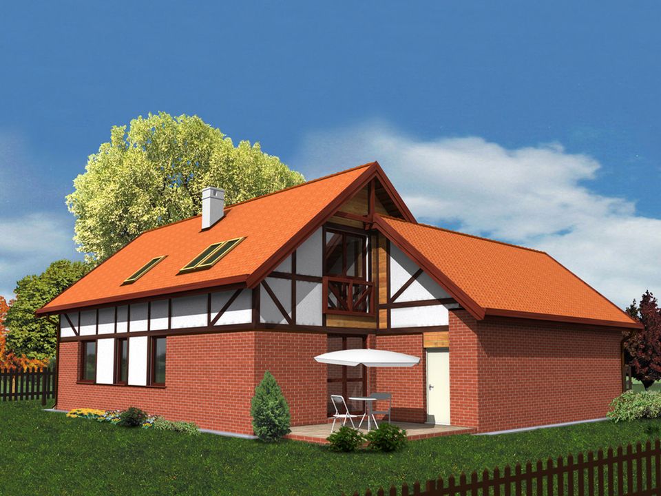 Graficzne opracowanie rzutów poglądowych widocznych na karcie projektu zostało wykonane przez Extradom.pl. Prezentowane przez Extradom.pl wizualizacje wykonane zostały przez autora projektu i należy poczytywać je jedynie za przykład i propozycję wykończenia, wizję architektoniczną autora projektu. Ostateczne wykończenie budynku może nastąpić na wiele sposobów. Szczegółowe rozwiązania zastosowane w oferowanej dokumentacji - w tym również ilość, lokalizacje i wygląd okien, drzwi, kominów - mogą w niewielkim stopniu różnić się od prezentowanej wizualizacji budynku.